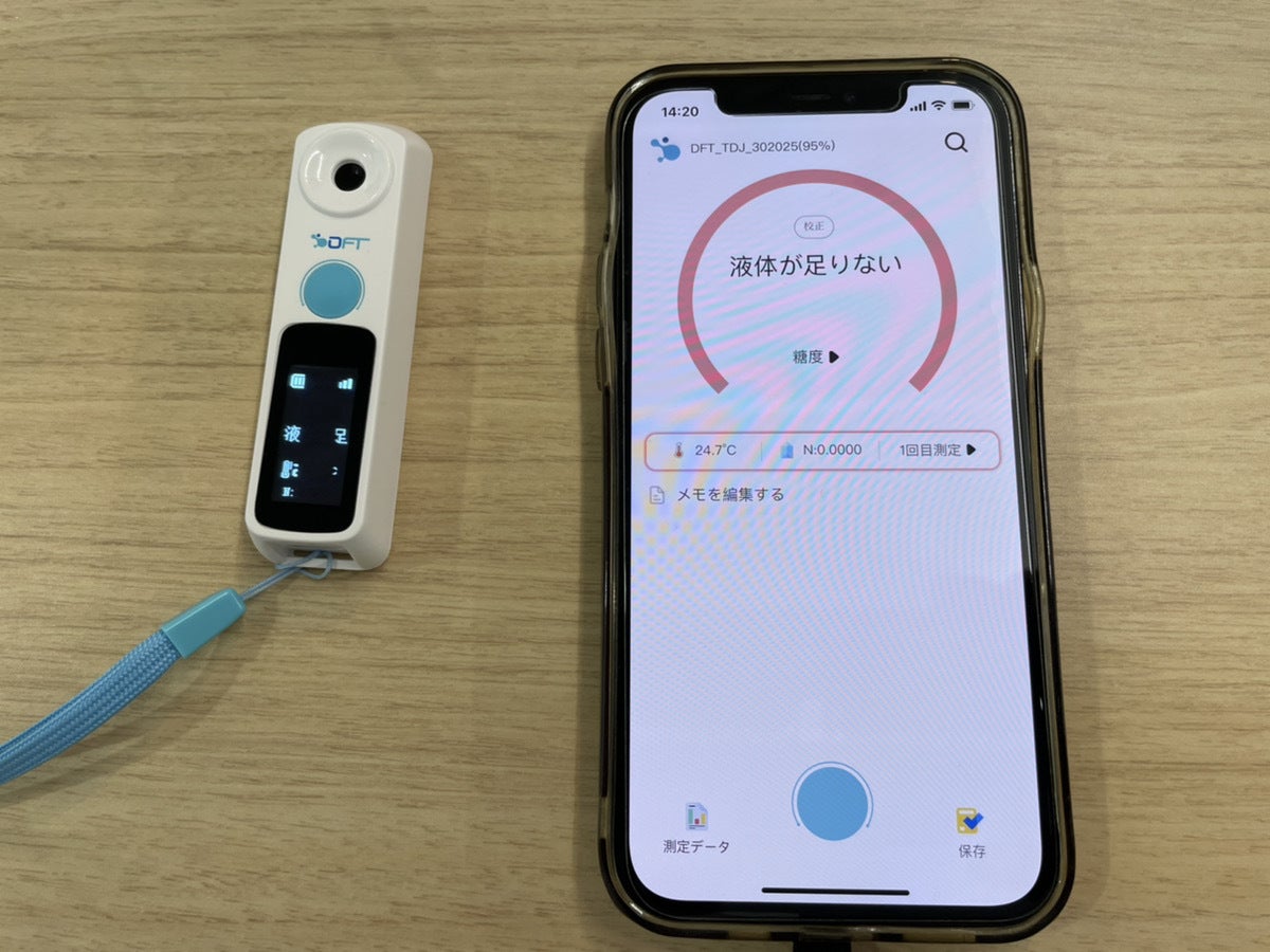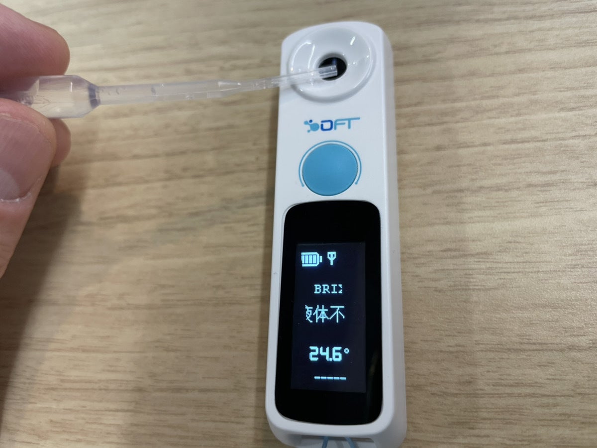 測定前は「液体が足りない」と表示されます。付属しているスポイトを使い液体を本機レンズへ垂らしてください。