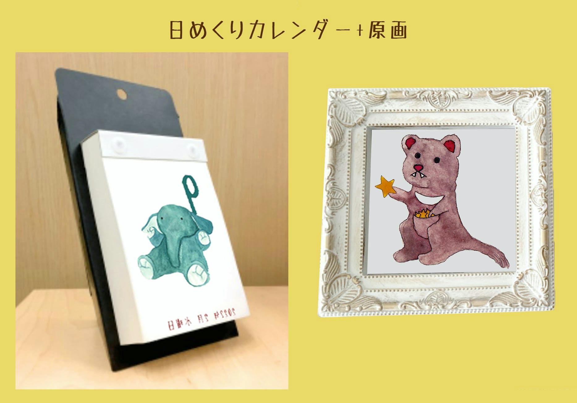 日めくりカレンダー1冊(サイズ11㎝×80㎝365日もの)に加えて、カレンダーに使われたイラストのオリジナル原画を送ります。はがきサイズ(10㎝x15㎝)