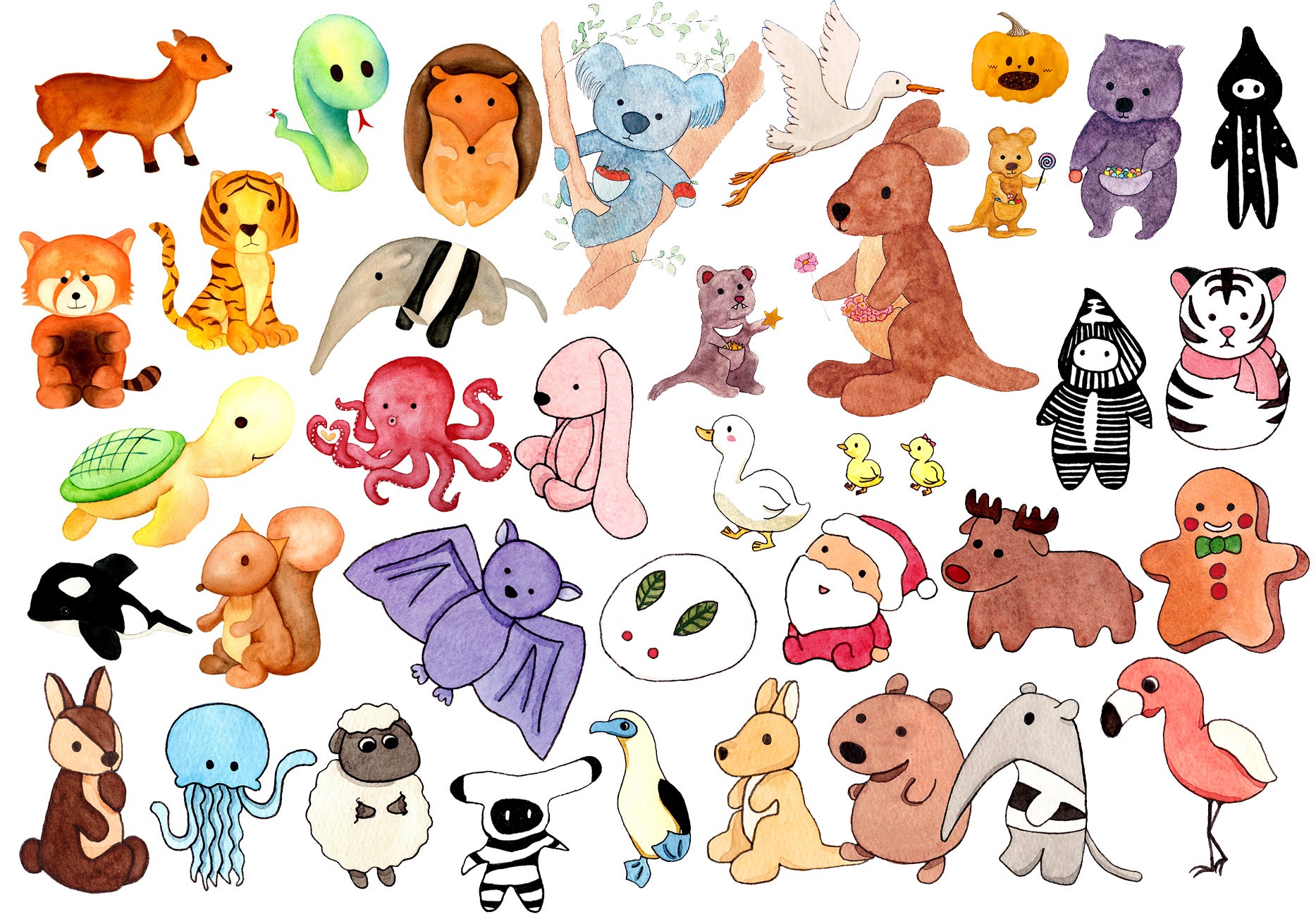 水彩で描かれたキャラクター達がほとんどで、ウサギやゾウ、ヘビやコウモリなどお馴染みの動物たちから、カッパなど想像上の生き物やなんの動物か謎のかわいい生き物たちもいます。