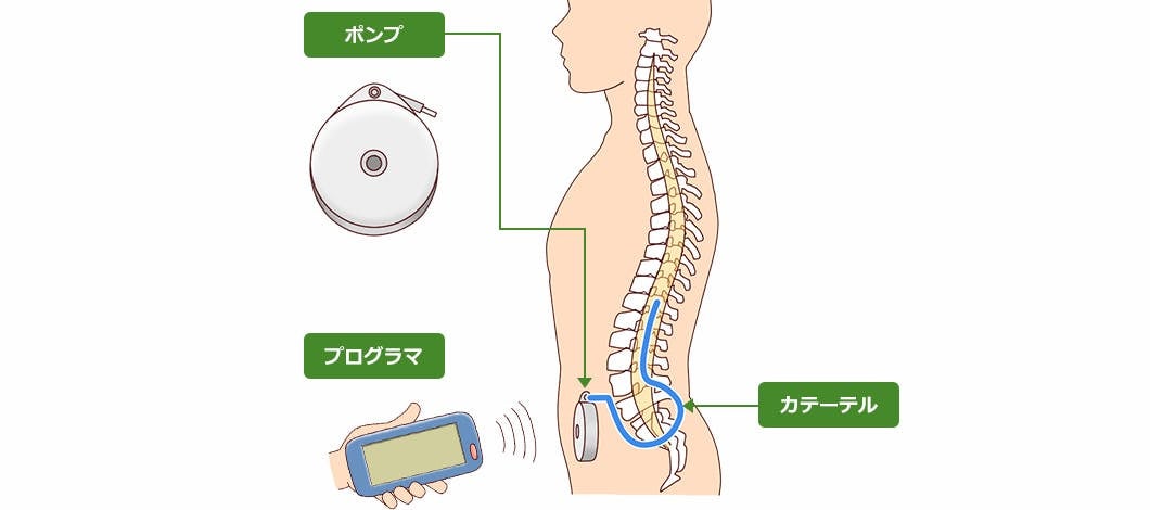 「バクロフェン髄注療法」とは、簡単に説明すると、おなかを切って、バクロフェンという薬が入ったポンプをおなかに埋め込み、脊髄まで管を通して、筋肉の緊張を直接和らげる療法のことです。