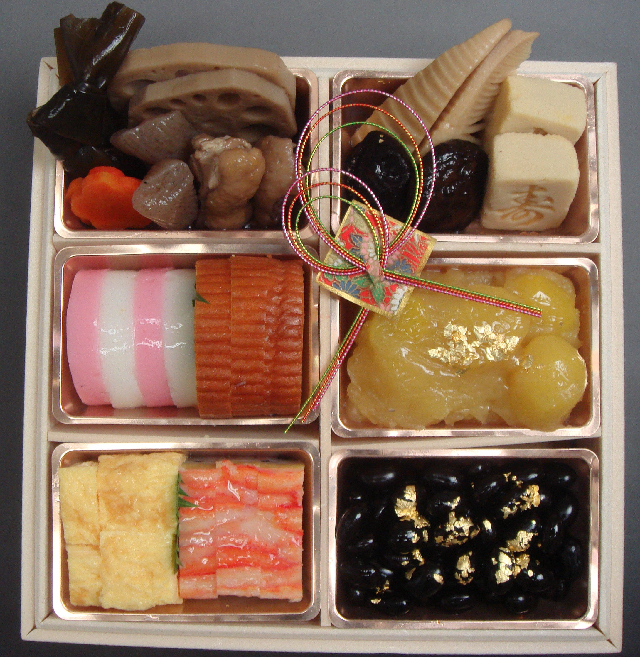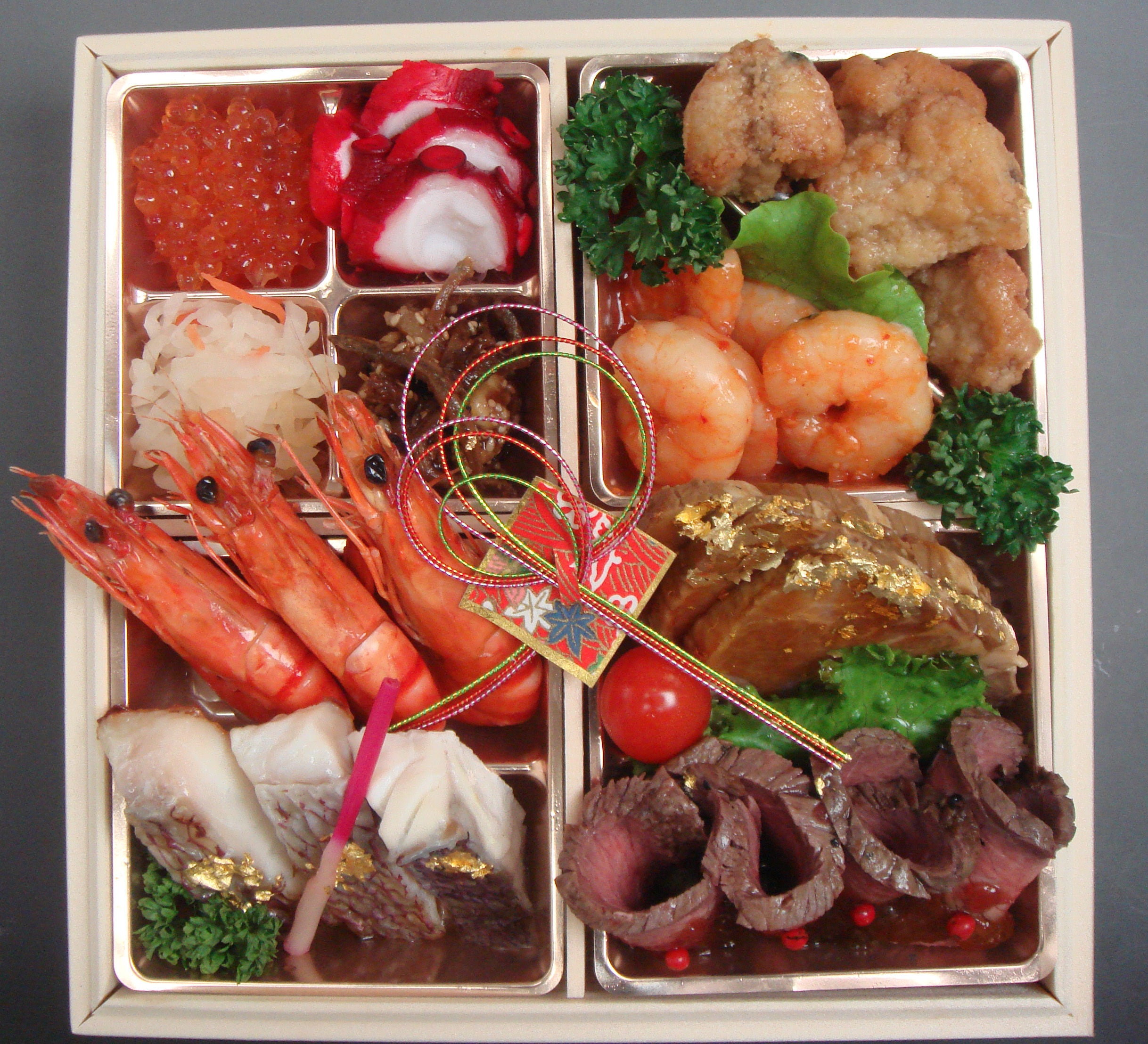 【原材料名】黒豆、栗きんとん、煮物(れんこん、椎茸、人参、昆布、こんにゃく、筍、高野豆腐)、蒲鉾、伊達巻、玉子焼き、かに蒲鉾、真鯛、海老、いくら、酢だこ、なます、小女子くるみ、ローストビーフ、焼豚、海老チリソース、ふぐ唐揚げ、プチトマト、パセリ、はじかみ、醤油、砂糖、本みりん、清酒、かつおエキス、醸造酢、果糖ぶどう糖液、食塩、コチュジャン、生姜、にんにく、トマトソース、たまねぎ、ごま油、酵母エキス、金箔/増粘剤(加工でん粉、キサンタン)、調味料(アミノ酸等)、pH調整剤、乳化剤、酸化防止剤(亜硫酸塩、エリソルビン酸ナトリウム)、ソルビット、香辛料抽出物、着色料(パプリカ色素、カロチノイド、クチナシ色素、赤105)、(一部に小麦・卵・乳成分・えび・かにを含む)