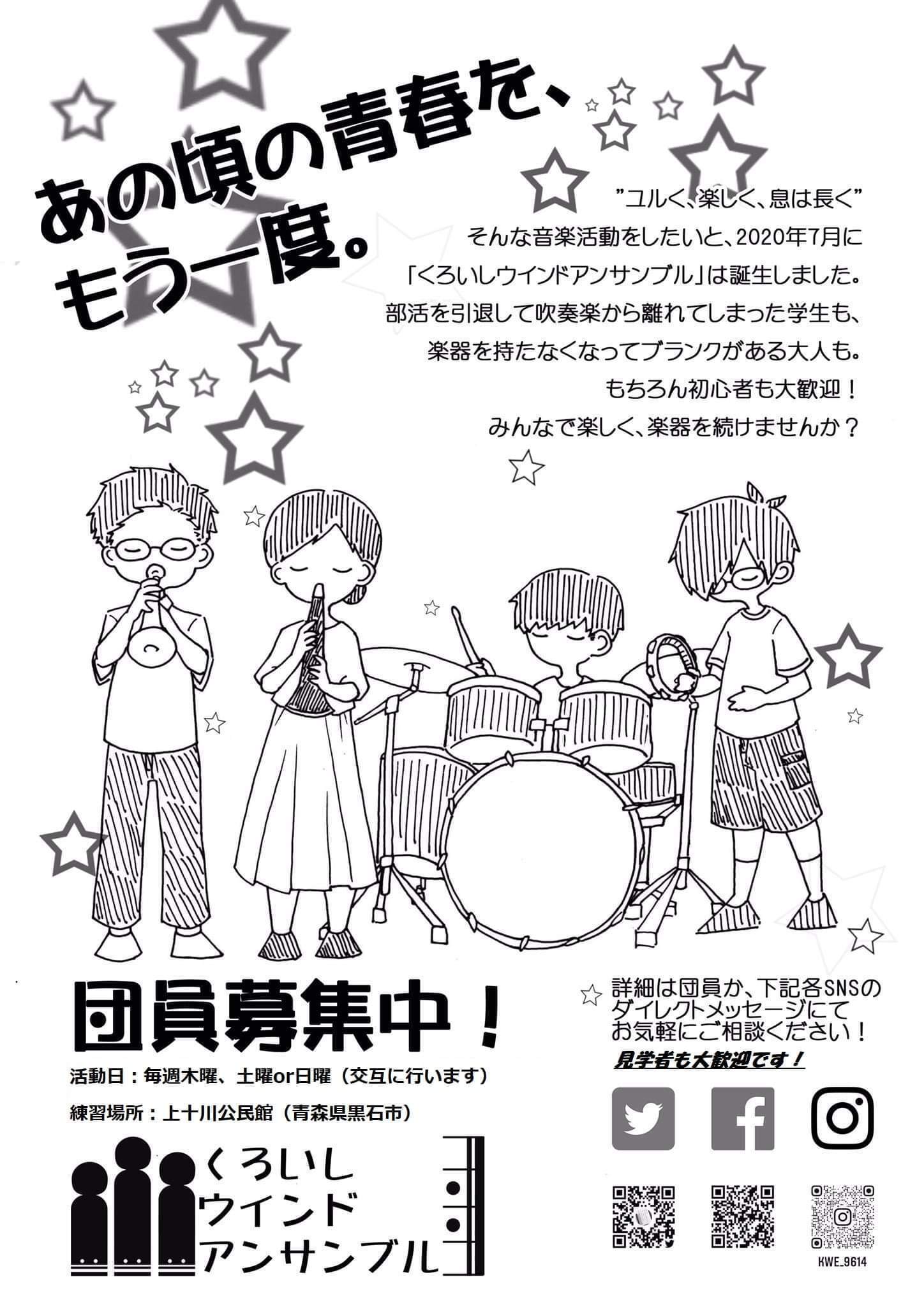 私たち、くろいしウインドアンサンブル(以下、くろいしWE)は「地域の音楽の灯を絶やさない」「音楽をしたい人たちの受け皿になりたい」という想いの元、2020年7月より活動を開始した吹奏楽団です。