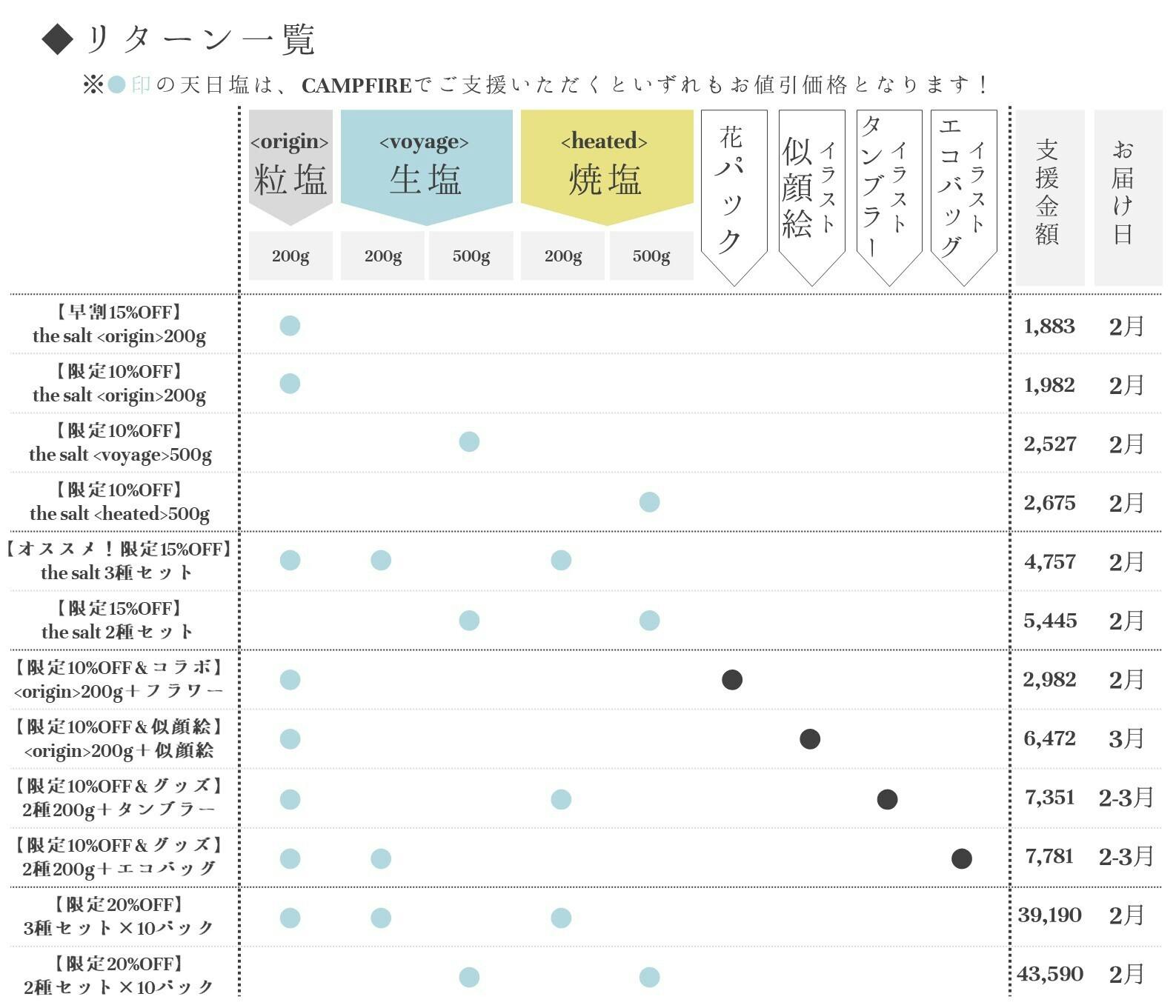 ※塩のみのリターンと発送時期が異なります。詳細は各リターンをご確認ください。