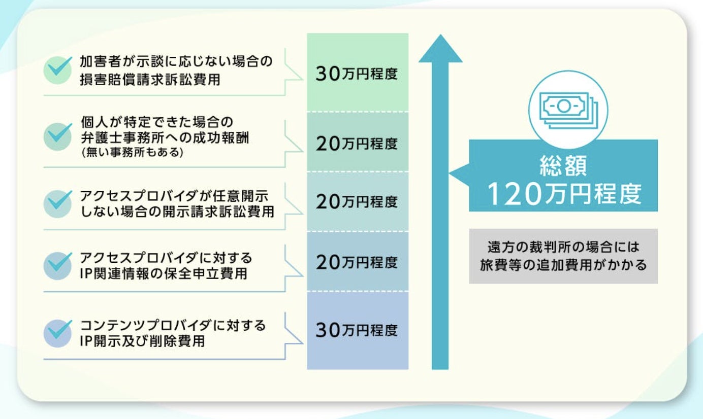 コンテンツプロバイダへの開示請求から、アクセスプロバイダへの開示請求、運良く加害者が特定できたら損害賠償を請求しますが、それまでにどのくらいの費用がかかるのでしょうか?