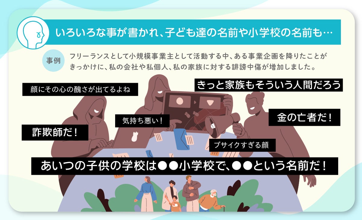 2015年頃、私はフリーランス(小規模事業主)として活動する中、ある事業企画を降りたことをきっかけに、私の会社に関する誹謗中傷、私個人や私の家族に対する誹謗中傷が発生し、増幅していきました。