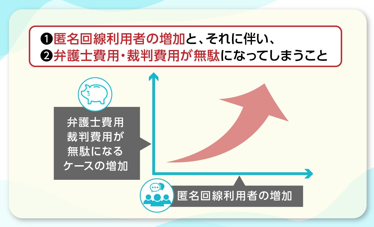 プロバイダ制限責任法が改正される見込みですが、現在は匿名化のノウハウを持つ誹謗中傷加害者が多く出てきています。それにともない加害者を特定する費用が無駄になるケースが増えてきています。