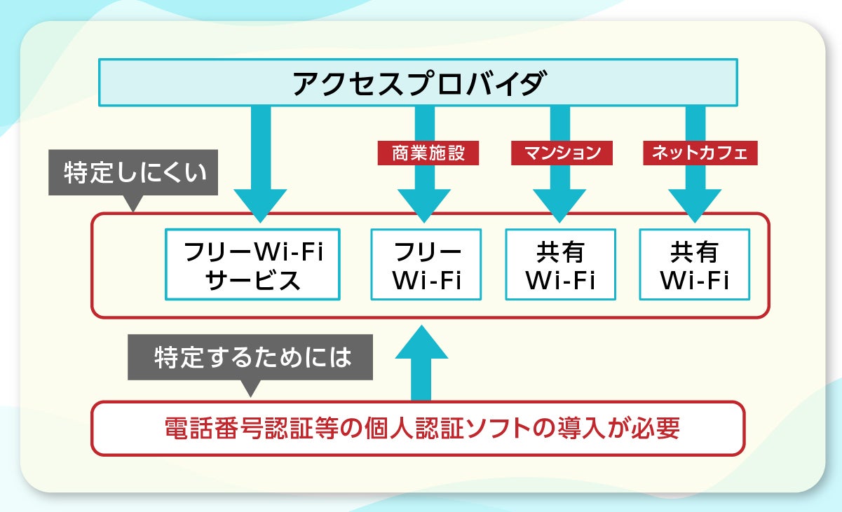 アクセスプロバイダは、情報を開示するためには、開示しようとする個人や法人から「開示してもよい」という許可をもらう必要があります。ネット回線利用者が商業施設などの場合には許可する場合が多いのですが、その場合は商業施設が設置する個人認証無しのフリーWi-Fiの場合が多く、個人が特定できません。