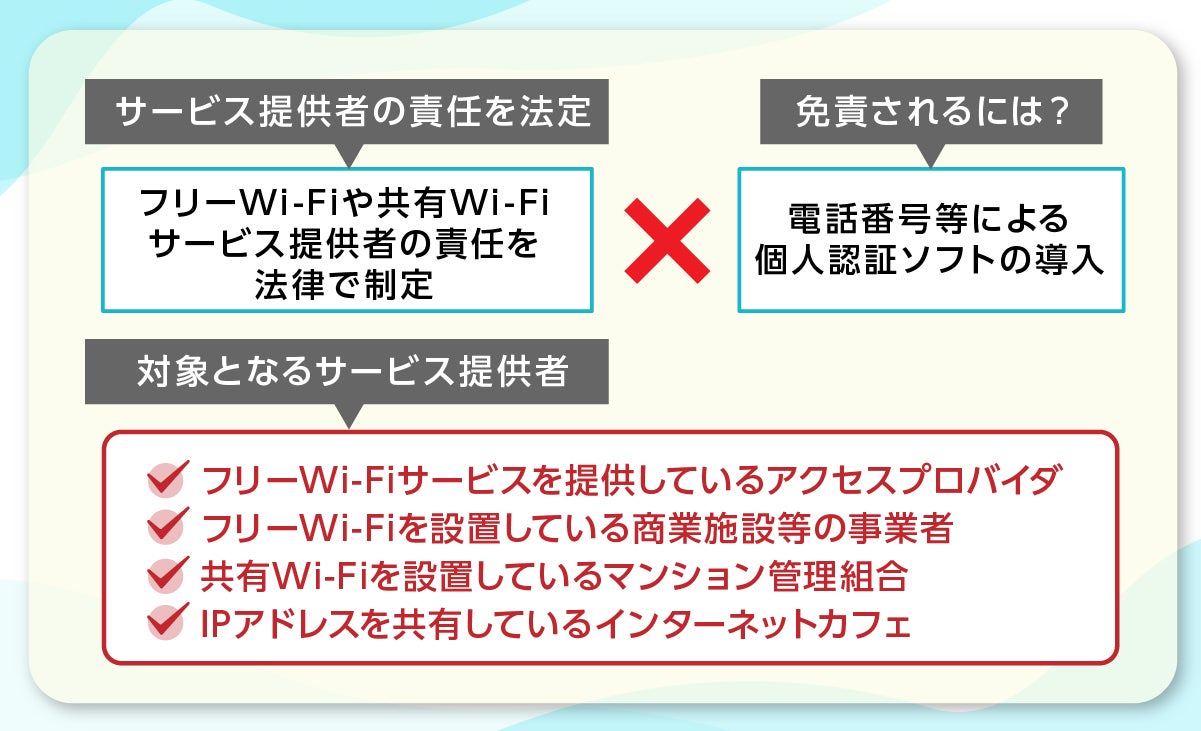 ①フリーWi-Fiや共有Wi-Fiサービス提供者の責任を法律で定める
