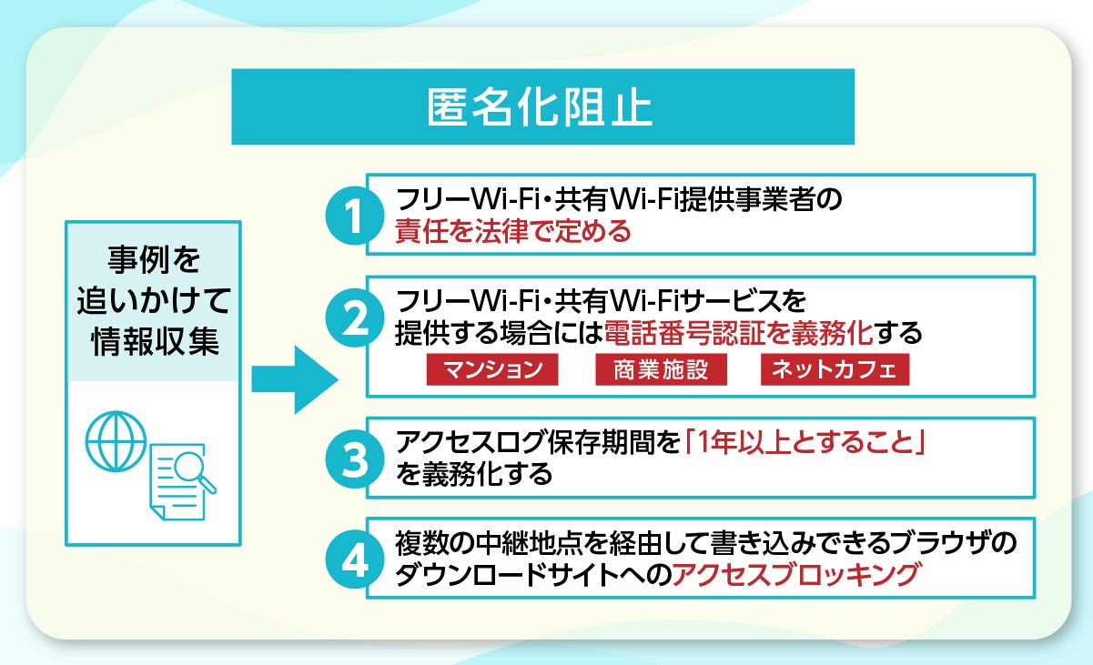 匿名化阻止のためには、「フリーWi-Fi」や「共有Wi-Fi」設置者責任法の制定が必要です。そして、フリーWi-Fiや共有Wi-Fiを設置するのであれば、電話番号(SMS等)認証ソフトの導入義務化とアクセスログの1年間保管義務化を、要望していきます。