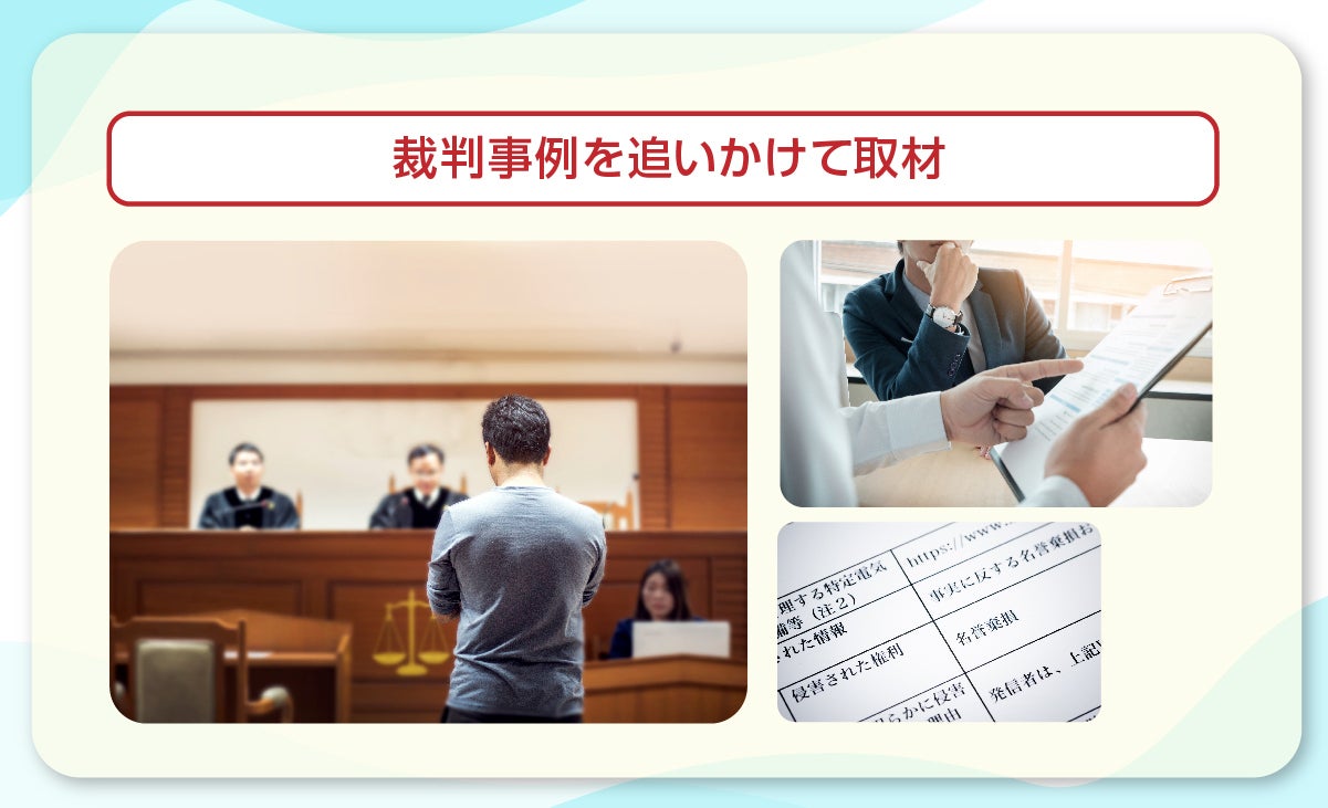 ご相談いただいた方々の裁判を取材いたします。2021年12月1日現在、16件以上の裁判を追いかけております。取材により特定できないネット回線情報を収集し、その回線を所有するアクセスプロバイダや事業者の情報を収集します。