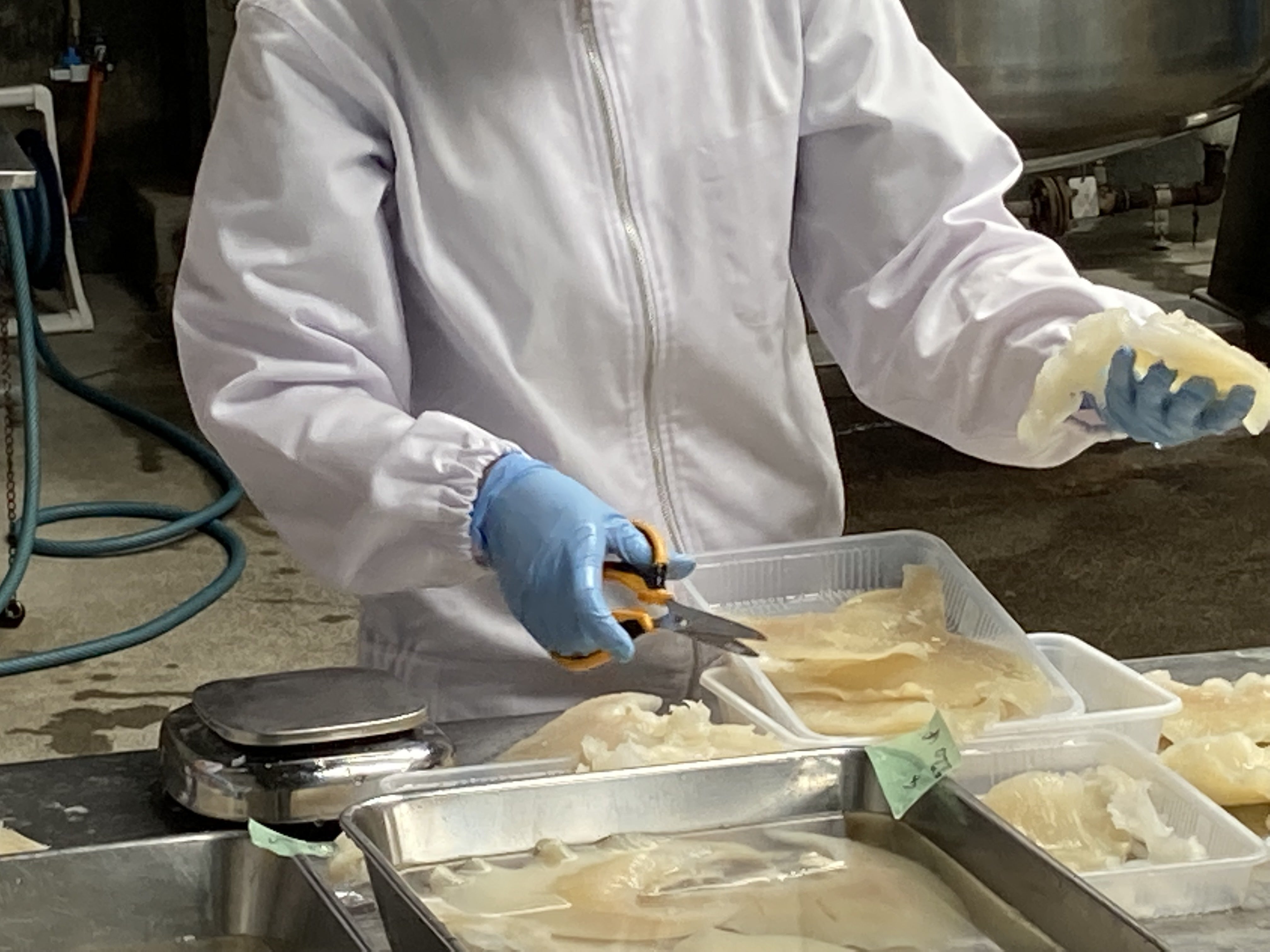 本日も手作業でふかひれを加工しています!ひとつひとつの作業にこだわりを持ち丁寧に扱って皆様のもとへお届けいたします!!