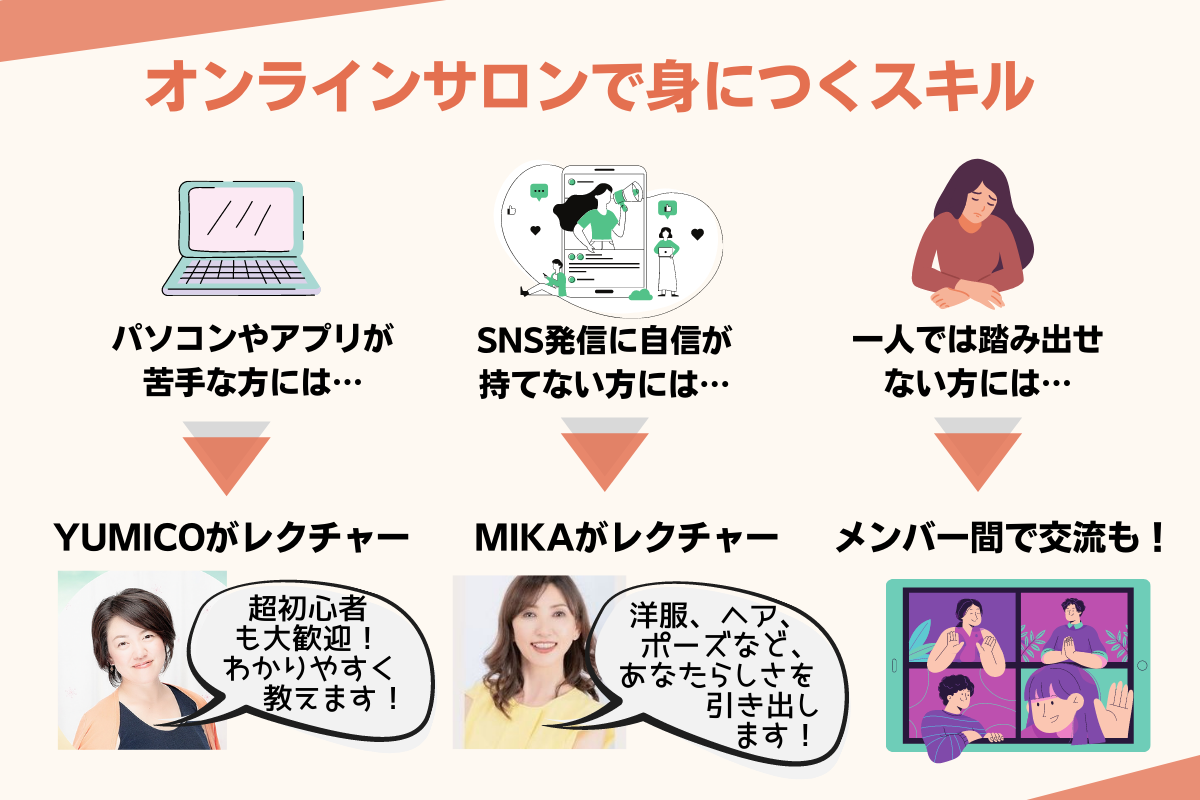 わたしたちが作るオンラインサロンでは、この2つのスキルがしっかり身につく講座や、お互いがサポートしあえる交流の場をたくさん用意していきます!