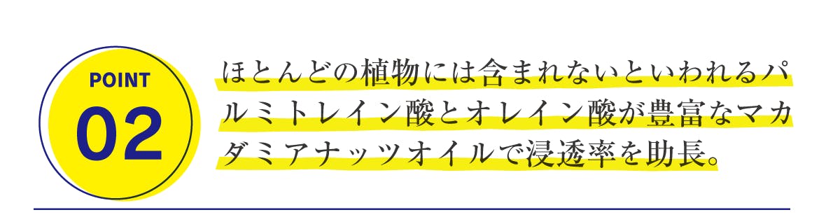 「バニシングオイル」消えてなくなるオイルとして注目のマカダミアナッツオイルには、ほとんどの植物には含まれないといわれるパルミトレイン酸が豊富に含まれていて、人の肌に最も近いといわれる植物オイルです。皮膚の皮脂や角質層の働きを整え、細かい粒子で長時間保湿し、シミ、くすみを予防するミネラルも豊富に含まれています。またマカダミアナッツの60%を占めるオレイン酸は長期保存に長けており、若さの脂肪酸と世界中から注目されています。肌馴染みがよく、あっという間に浸透するので表面はべたつかずにさらさら、内側はしっとりと潤してくれるミラクルオイルです。
