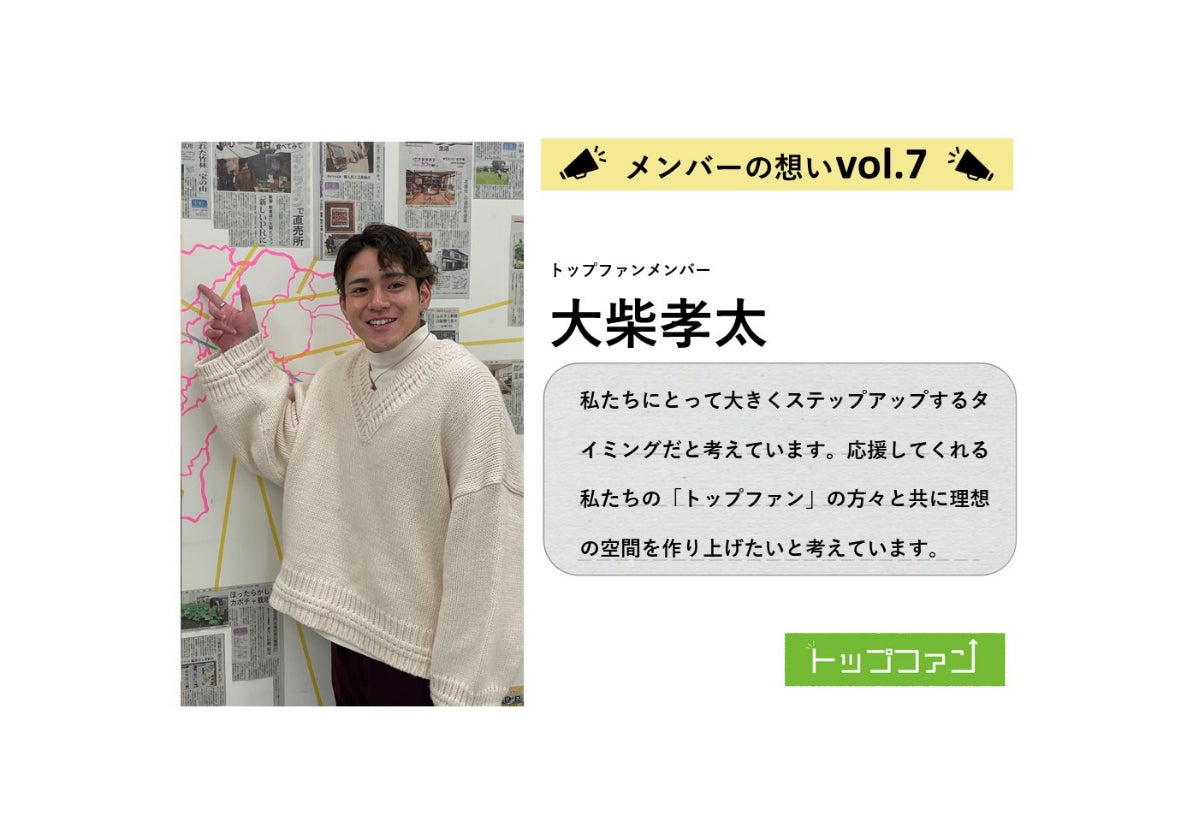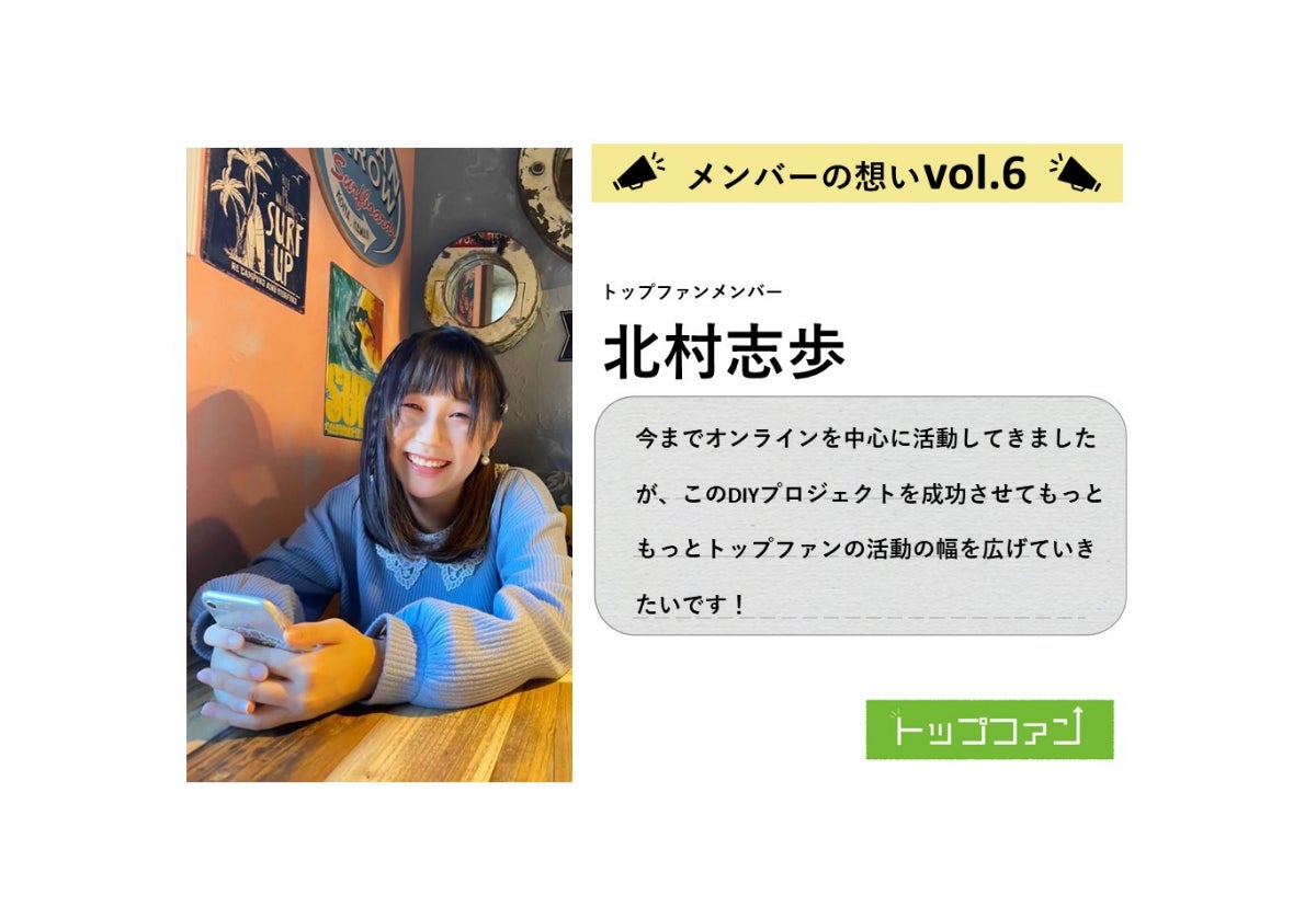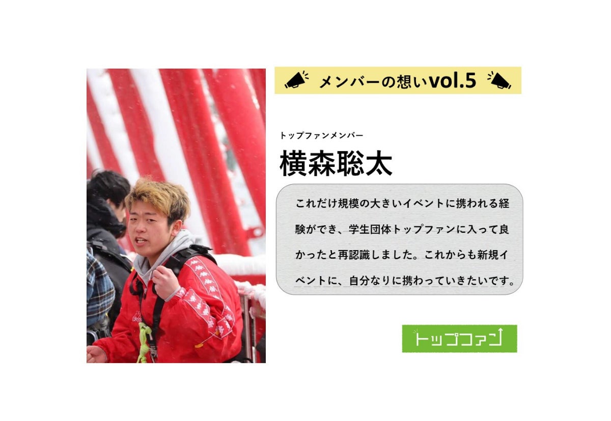学生団体トップファンの大柴孝太です。私は北杜市出身で現在は山梨大学工学部で機械工学を先攻し、ドローンの研究を行っています。私とトップファンとの出会いは、夜中に共同代表から掛かってきた『山梨で何かやろうよ』というあの頃はとてもアバウトで、でもとても思いのこもった熱い電話はきっかけでした。その一本の電話で自分達の生まれた、そして自分達の住む山梨をより良くしたい思い持ち、また、「山梨で何かやる」このアバウトな言葉に大きな可能性を感じました。根本にあるこの思いが今のトップファンの活動につながっていると思います。私は、トップファンの活動で主に地域資源を活かしたスポーツイベントの企画・運営を行なっています。スポーツには地域を盛り上げる力があると考えています。これまで、2回スポーツイベントを行なってきました。今後も「スポーツ×地域資源=地域活性化」の方程式を仮定し、山梨県各地の地域資源を活かし、イベントを行なっていきたいと考えています。DIYはこれまでトップファンで多くの活動で行なってきました。今回のDIYプロジェクトがトップファンにとって大きくステップアップするタイミングだと考えています。私たちを応援してくれる私たちの「トップファン」の方々と共に理想の空間を作り上げたいと考えています。