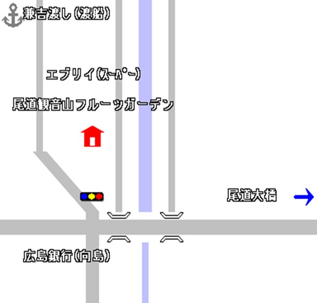 尾道市向島町兼吉551一番街。尾道大橋下りて西へ車1分。兼吉渡し(渡船)降りて600m