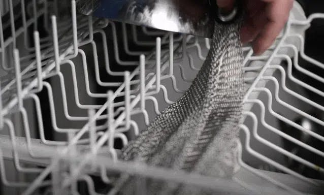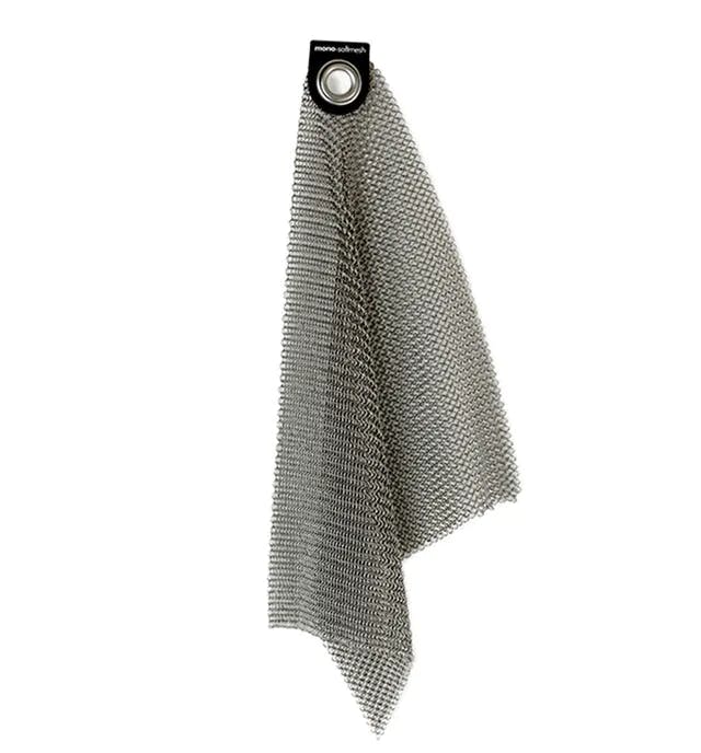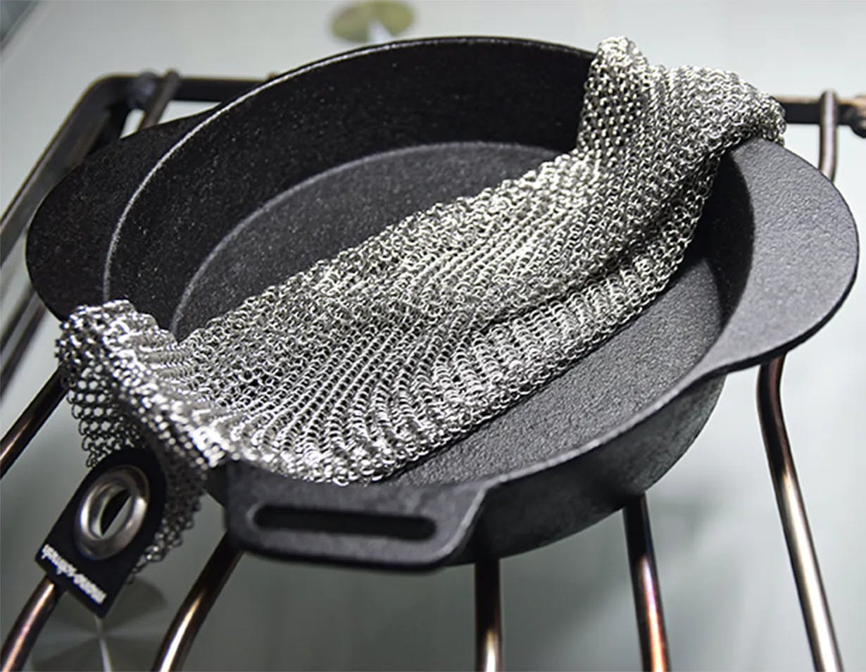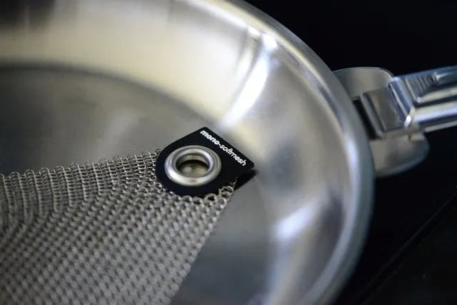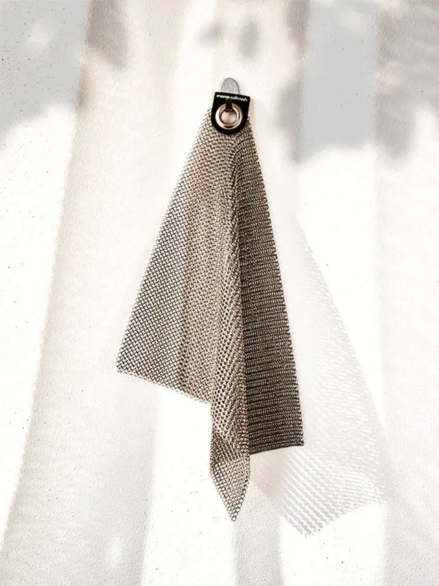 SOFTMESHは小さなステンレス製のリングを繋ぎ合わせた、特殊なクリーニングクロスです。汚れが中に入ることがなく、雑巾がけをするようにゴシゴシと鍋やフライパンなどを洗えます。