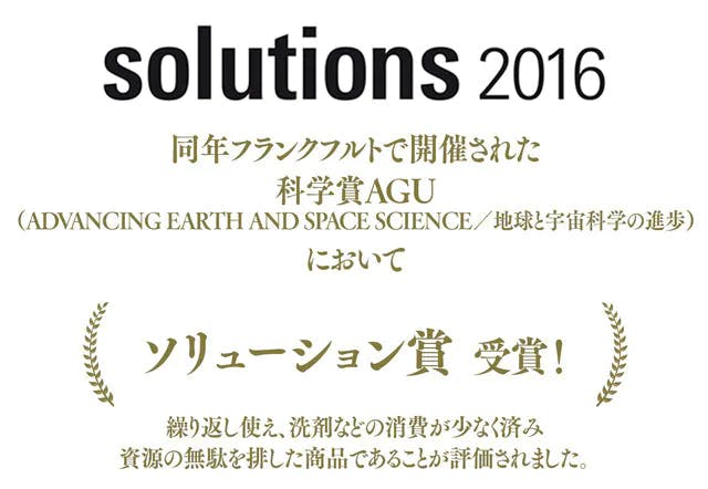 また同じ年にフランクフルトで開催された科学賞AGU(ADVANCING EARTH AND SPACE SCIENCE/地球と宇宙科学の進歩)において、繰り返し使えて洗剤などの消費が少なく済み、資源の無駄を排した商品であることが評価され「ソリューション」賞も受賞しています。