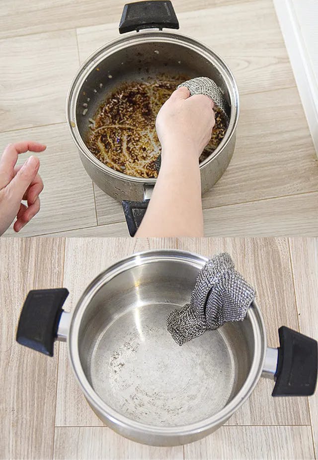 硬く細やかなステンレスのリングがブラシの役割を果たし、お鍋やグリルにこびり付いた焦げ汚れを次々に削ぎ落とします。