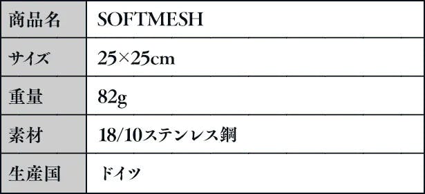 ドイツで1895年に創業した歴史あるキッチンツールメーカーMONO社のSOFTMESHは、日本ではまだあまり馴染みのない形状のキッチンウェアかと思います。