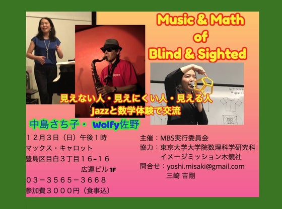 音楽と数学という、バリアフリーである世界において自由な楽しい交流を作り出したいと考える。 休日のマチネーなので保護者同伴等での、盲学校や弱視学級普通学級で学んでいる小学生の参加も期待したい。
