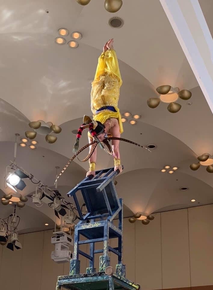 重ね合わせた椅子の上でバランスを披露するサーカスパフォーマンス