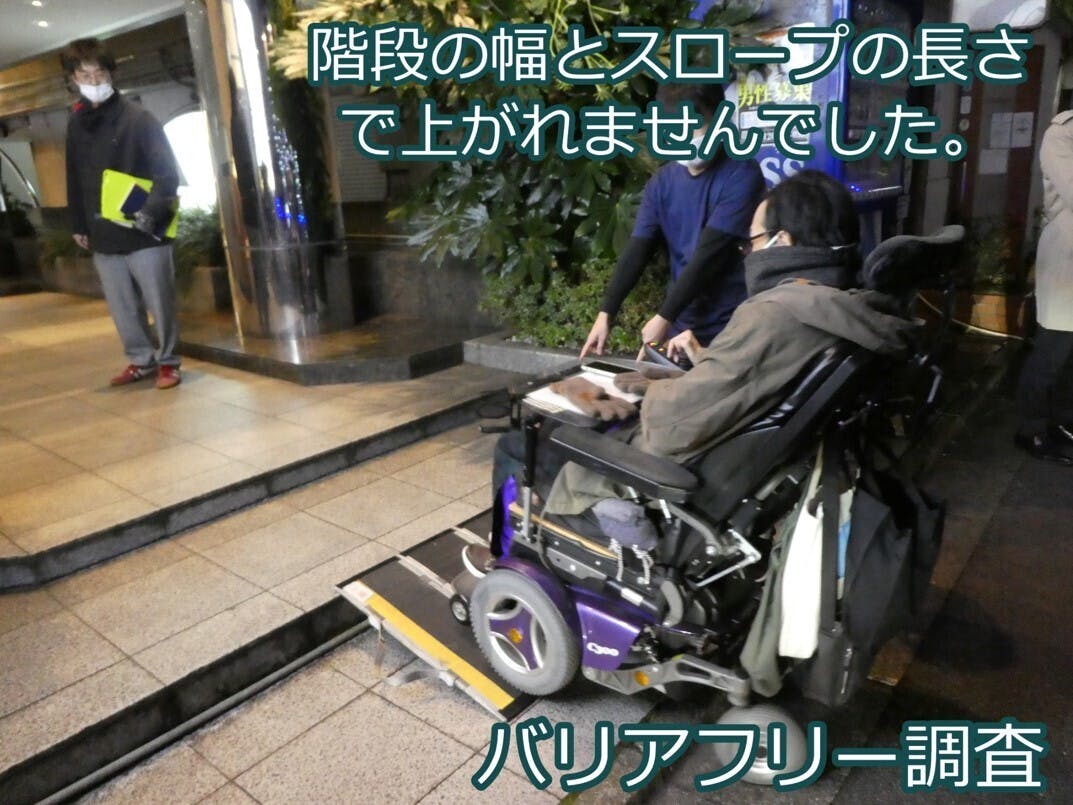 ひととひとが助け合い、例えば階段を車椅子を持ち上げて入店してもらうことも良いでしょうが、最近は、大きい電動車椅子や、従業員さんの人手が足りなく入店できないこともあります。