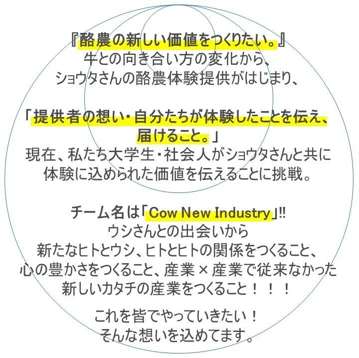 そんなちょっと変わったショウタさんと出会い、実際に体験をした私たち大学生・社会人がチームを組みウシさんと向き合うことの面白さを届けることに、今チャレンジさせてもらっています。