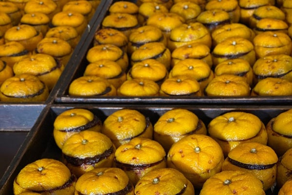 源平の時代から生まれたと伝えられる「ゆべし」。菓子というよりも保存食・携帯食として親しまれてきました。遡ること530年、室町時代。御所に仕える女官たちによって、書き継いだ当番日記『お湯殿の上の日記』に、「ゆべし」の由緒正しい記述が残っています。ここには、製法などは書かれていませんが、加賀藩前田家に仕えた料理頭舟木伝内の息子、舟木安信が書いた料理書『料理物語』には、レシピが記載されています。それは、味噌、生姜、胡椒をよくすり混ぜ、榧(かや)、胡麻、杏仁を加え、身をくりぬいた柚子の中に入れて蒸し、そのあとよく干すという製法。これがオリジナルの「丸柚餅子」レシピとして、包丁侍と呼ばれた料理人らの手によって洗練し伝承され、時代が進むにつれて、甘味を強くした和菓子なども登場するようになります。