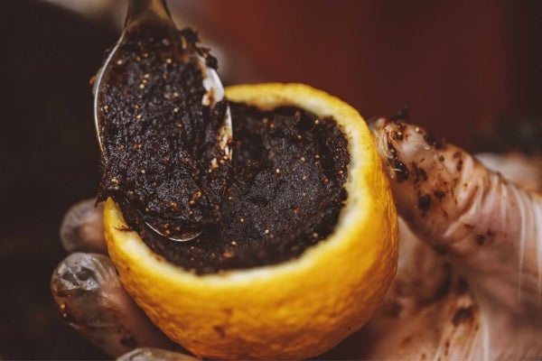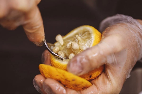 ▼柚子の中⾝をくり抜き。