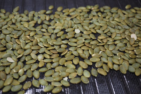 ▼かぼちゃの種は、オーブンで素焼きにし、香ばしく下処理します。