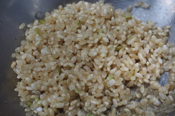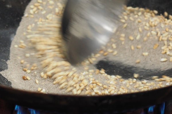 ▼鍋に塩をたっぷり入れ、200度近くまで温めて、玄米を投入し素早く攪拌します。(塩揚げ・ソルトフライという技法)