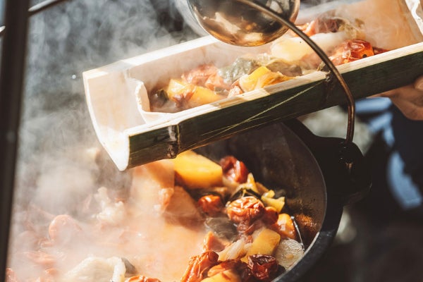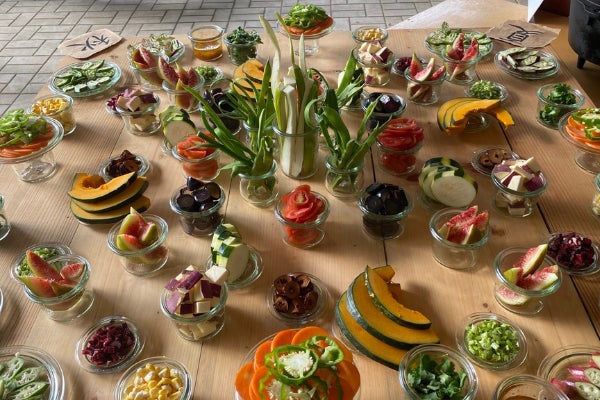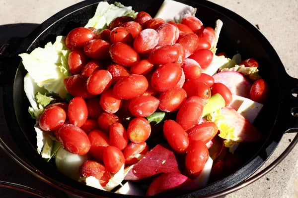 昼食は地元の無農薬野菜で作るヴィーガンダッチオーブン料理と羽釜ごはんをお楽しみください。