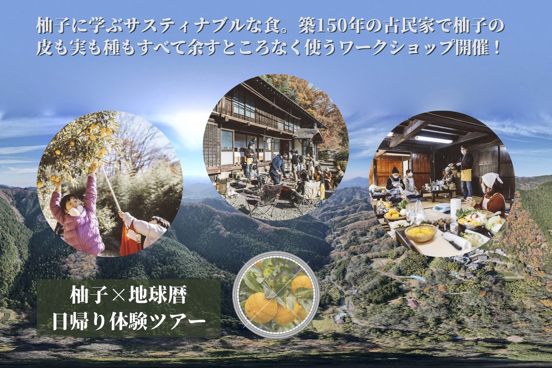 都会から一番近い里山・藤野。大自然に囲まれた築150年の古民家で、無農薬栽培の柚子をご自身で収穫し、地元の方と一緒に柚餅子とジャムをつくり、柚子の種を使った化粧水づくりを体験できる日帰りツアーです。