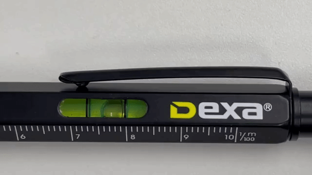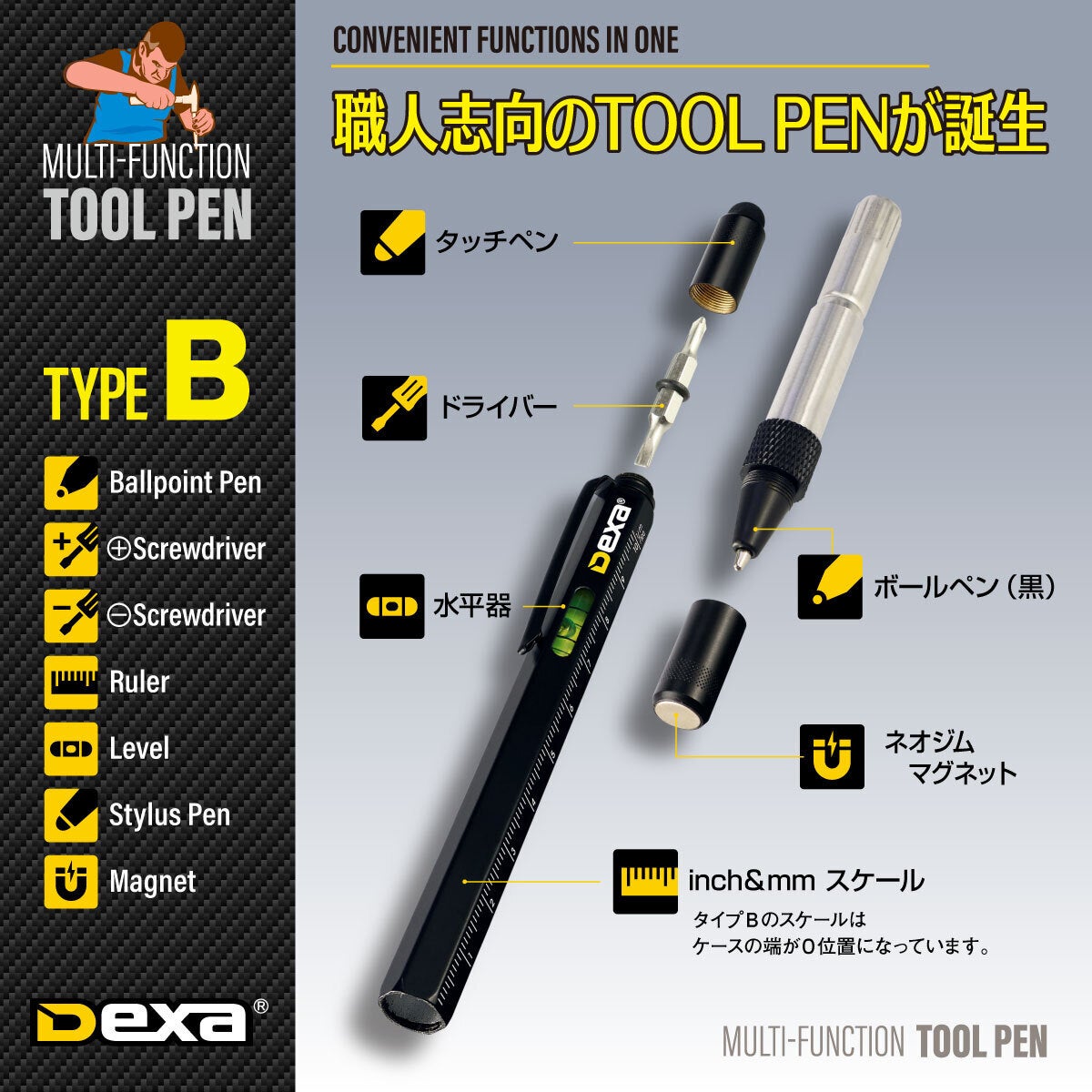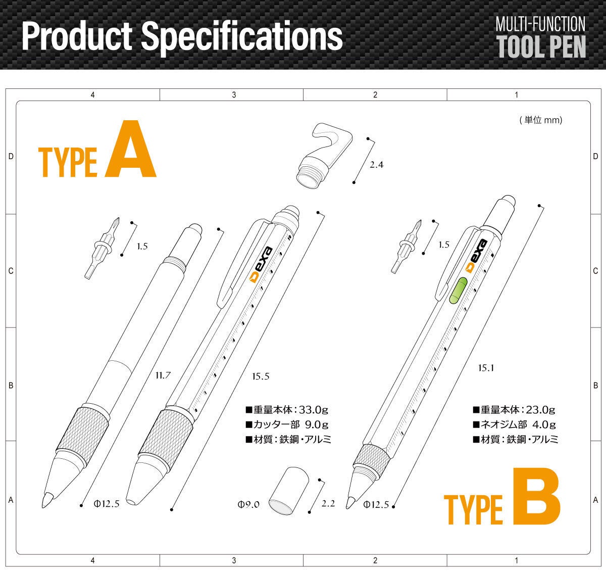 ◇TYPE B では、ネオジムマグネット・水平器を中心とした設計にしました。ボールペンは、メインの黒、また、本体スケールについては、本体の接点から「ゼロ」位置で測定できる、「0スケール」を採用しました。