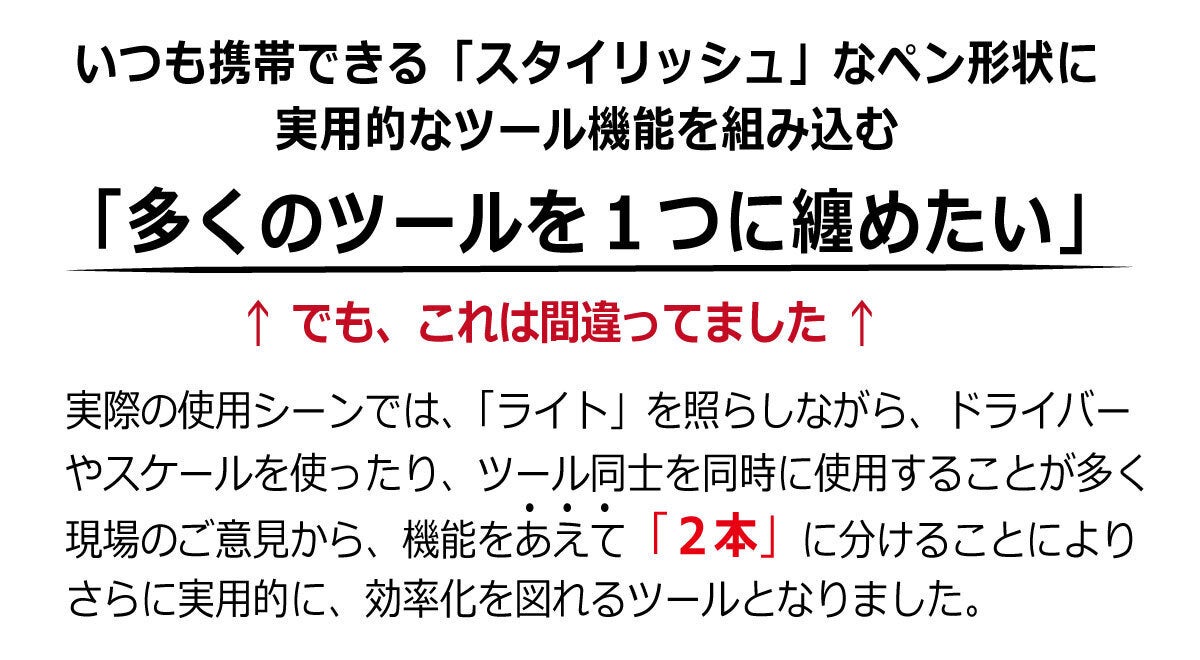 ◇最近ではホームセンターにも「DIYコーナー」が増え、何かと人気がありますね。業種を問わず、ご自宅や車内に「マルチツールペン」があれば、活躍すること間違いありません。