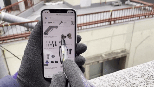 職人:「おいっ、ネジが隙間に落ちたよ、ライトとスケールとってくれ!」