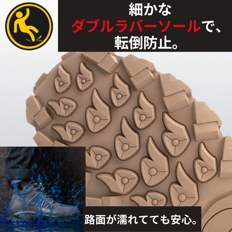 つま先には「耐衝撃性スチール」を使用。プロモーション動画の中では車で轢いてみたり、重量物を落としていました。そういった衝撃にも負けない耐性を持ち合わせています。