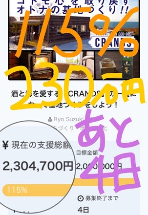 ただいま、115%、230万円まで支援が積み重なり、支援してくださった皆さんへ大変感謝しております!