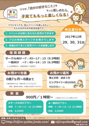 にじいろポッケ with ぺたぞうでんしゃ王国 コラボ決定!! にじいろポッケの四辻さつきです。 クラウドファンディングを始めたことで、様々な方からご連絡をいただけるようになりました。 そして一つ、とても素敵なニュースがあります。 今回の冬コミから、ファミリー向けのイベント等で「組み立ておもちゃ」を使った子どもの遊び場を提供してらっしゃる、「ぺたぞうでんしゃ王国」さんとコラボさせていただくことになりました! ぺたぞうでんしゃ王国さんのご協力で、上の写真のスゴイ「立体レール」の他、木製レールの「BRIO」や、玉転がしコースを作れる「trixtrack」などを、にじいろポッケの託児会場にたくさんご用意して、子ども達に遊んでもらえることになりました♪ 特に立体レールは、3~4時間かけて作る超大作。 もちろん、子ども達が実際に触って遊べますし、自分で自由にレールを作るパーツもたっぷりあります! 「親の都合の託児」ではなく、「子どもも大好きで楽しみにしているおでかけ」に! ぺたぞうさん達とのコラボで実現できると思っているのは、単におもちゃが増えるということだけではありません。 これまでは、どれだけ安全な場所でプロに保育をしてもらっても、「親の趣味のために子どもを預ける」ことに、どこか後ろめたさを感じてしまう部分があったかと思います。 でも、家では遊べない、夢のようなおもちゃがたくさんある空間にすることで、 託児を、「子どもも大好きで楽しみにしているおでかけ」にしてあげたい!! そんな新しいプロジェクトに、ぺたぞうさん達と一緒に挑戦したいと思います。 対象年齢を0歳~8歳→0歳~12歳に! これまでは、お預かりの対象年齢を、「0歳7ヶ月~8歳」としていました。 長時間、同じ室内で全員を保育しなくてはいけないことや、用意できるおもちゃに限界があることから、「小学校高学年」のお子様はお預かりできなかったのです。 にじポケの会場写真を見ながら申し込みを検討する方も、5・6歳以上の元気いっぱいのお子さん(特に男の子)などは、預けて大丈夫だろうか…と悩まれることもあったのではないでしょうか? でも、ぺたぞうでんしゃ王国さんとのコラボによって、幼児~小学校低学年はもちろん、小学校高学年のお子様まで、十分楽しんでいただける環境になりました。 そこで、対象年齢を「0歳7ヶ月~12歳」と広げることに決めました。 もちろん、小さなお子様には、これまで通り、少人数制の家庭的な保育をしっかりと行います。 託児会場にお借りしている場所は、241平米と非常に広く、部屋を備え付けのパーテションで区切ることができます。 小さなお子様にとって危険なもの(小さなパーツや玉転がしの玉など)は触れさせないように、またセットを壊してしまうことのないように安全対策を致しますので、ご安心下さい。 大人も子どもも、心から楽しめる一日に! ぺたぞうさんは、クラウドファンディングをきっかけににじいろポッケを知って下さったそうです。 自分がやっている活動が役に立てないかと考えて下さり、わざわざご連絡を下さいました。 本当にありがとうございます!! ◆ぺたぞうでんしゃ王国さんのHPはこちら↓ また今後、こうした楽しいコラボを色々な方としていけたら嬉しいなと思っています♪ 大人が同人イベントを楽しむのはもちろん、 子どももまるでイベントに参加するようにワクワク楽しめる一日にして、 「明日も行きたい」「来年も行きたい」と思ってくれる… そんな場所にしていきたいです。 なお今後の託児について、この先半年分の、全ての日程で受付を開始しました。 ⇒各イベントの料金とお申し込みはこちら これまでお子様の年齢等を理由に申し込めなかった方も、ぜひご検討いただければ幸いです。 どうぞよろしくお願い致します♪