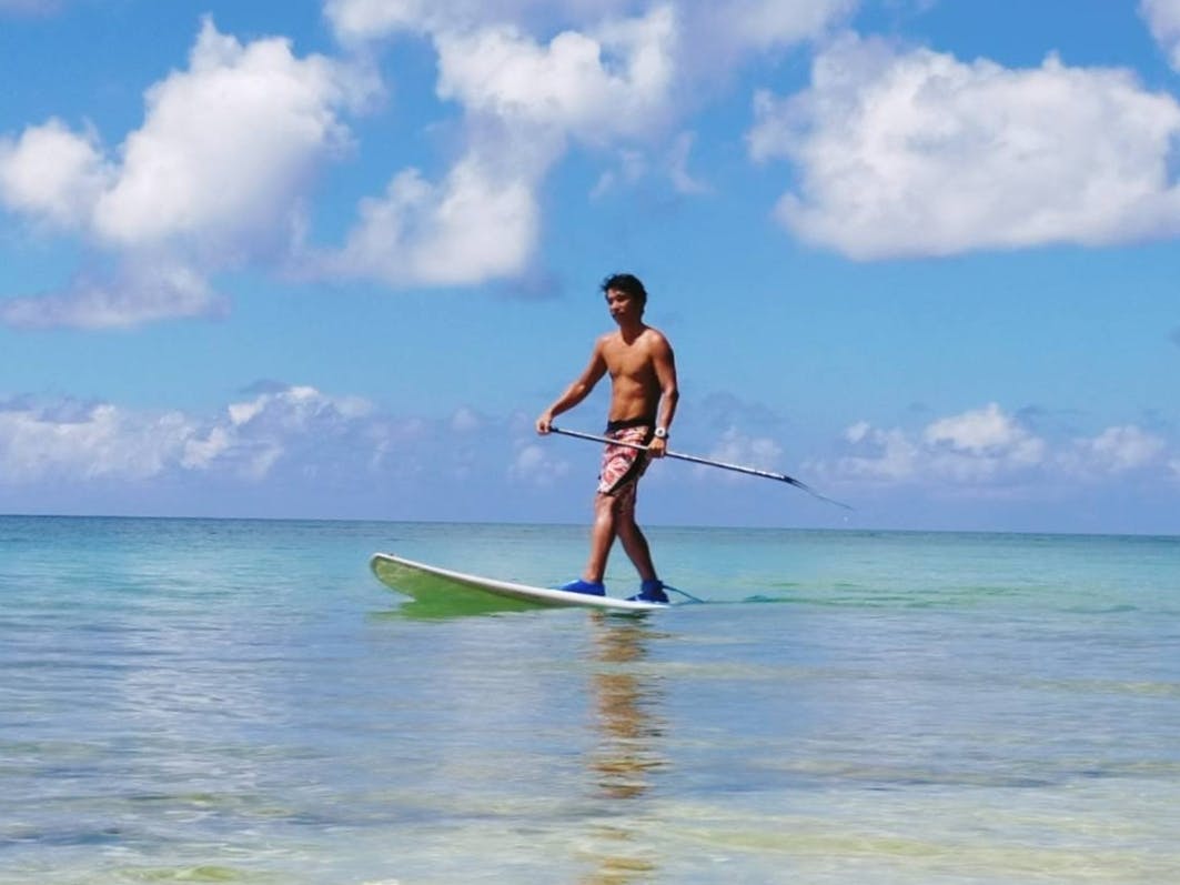 石垣島が地元である私は、県外からきた知人と一緒に久米島へ旅行に行き、【ハテの浜】でツアーに参加した際に乗ったのが初めてのSUP体験でした。