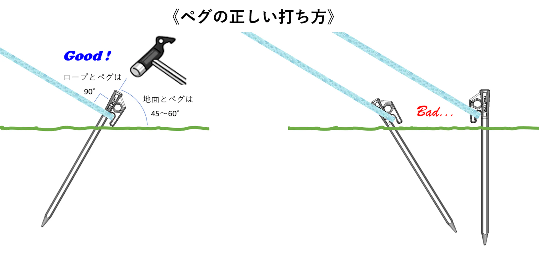 ・ペグをクロスさせて打ち込む時には、ペグ同士(特にフック部)の干渉に注意してください。干渉した状態で無理に打ち込むと、破損の原因になります。
