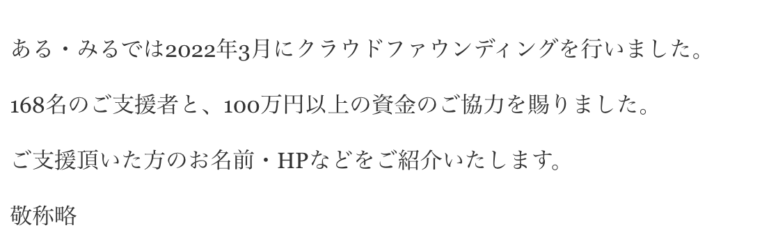皆さんご無沙汰しております。クラウドファンディングでお世話になり、ありがとうございました。昨年の8月からアプリをリリースしましたが・・使いづらい箇所などが多々あり、現在大幅アップデートについて準備を開始しております!そして今年になり・・神社や地域の空き家コミュニティを活用してイベントを開催できるようになりました!今後も、リアルとネットの ハイブリットアプリとしてみなさんのお役に立てるよう頑張っていきます!お知らせ2月19日(日)映画の上映会を東京都世田谷区の神社で開催します!https://umarekaeri.peatix.com/viewまた毎月、色々な座談会なども開催しております。こちらもぜひお越しいただき、ある・みるの様子をぜひ見に来てください。2023年1月のプログラム ◆あなたは大丈夫? 作品やデザインの知的財産の権利を守ろう! 知的財産権×クリエイター 山口かな 17日 14時からhttps://peatix.com/event/3439711/ ◆【教える】を始めてみませんか? あなたのスキルは誰かにとっての宝物! 先生になりたい人向け講座 初級編 28日(土曜日)10時から https://arumirukousi.peatix.com/ ◆ひととつながる!可能性が生まれる ある・みる交流会 27日(金曜日)20時から https://peatix.com/event/3451931/ ◆ポットキャスト公開収録 2月2日 14時から15時半 https://arumirukoerabo.peatix.com/view