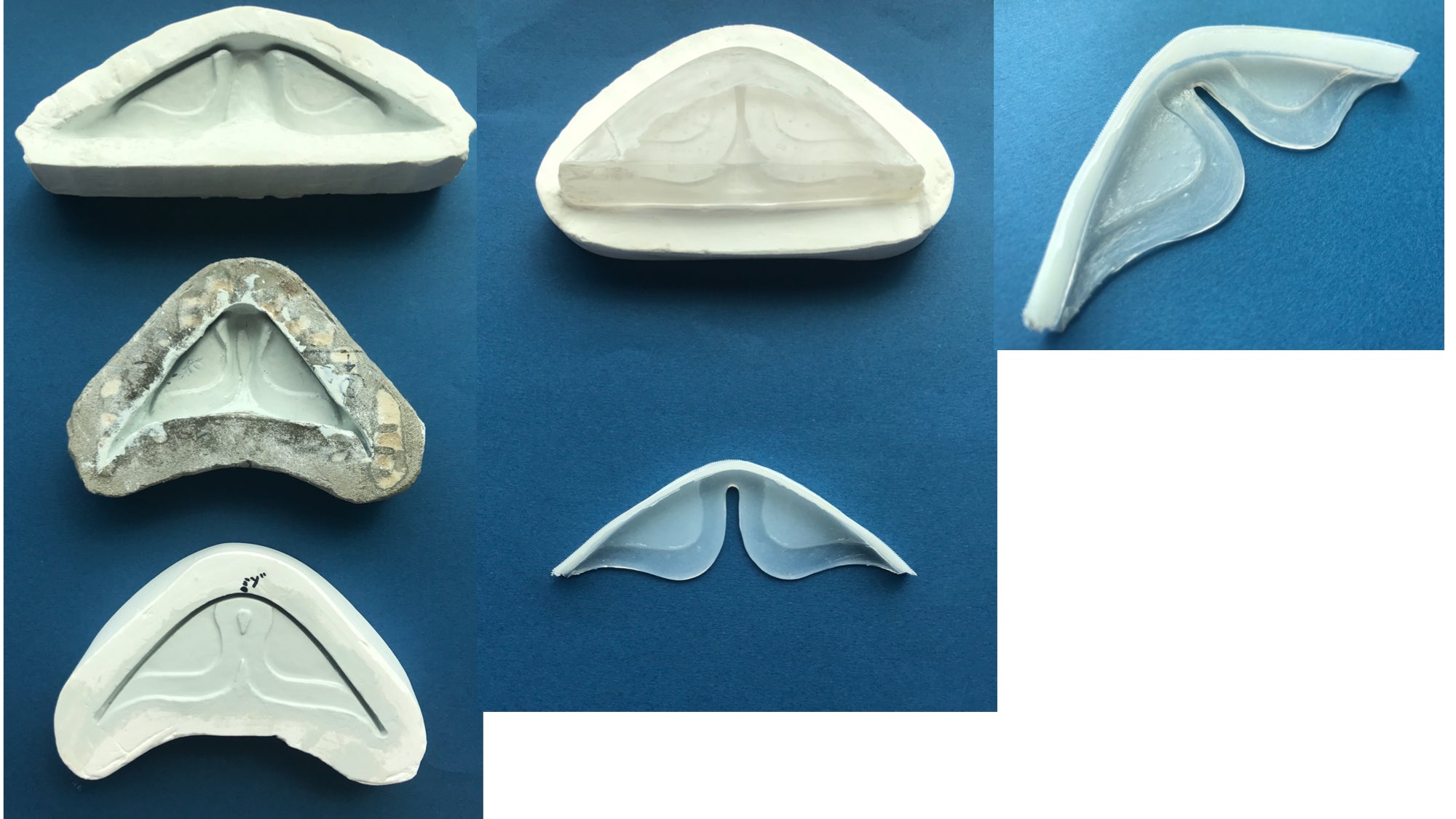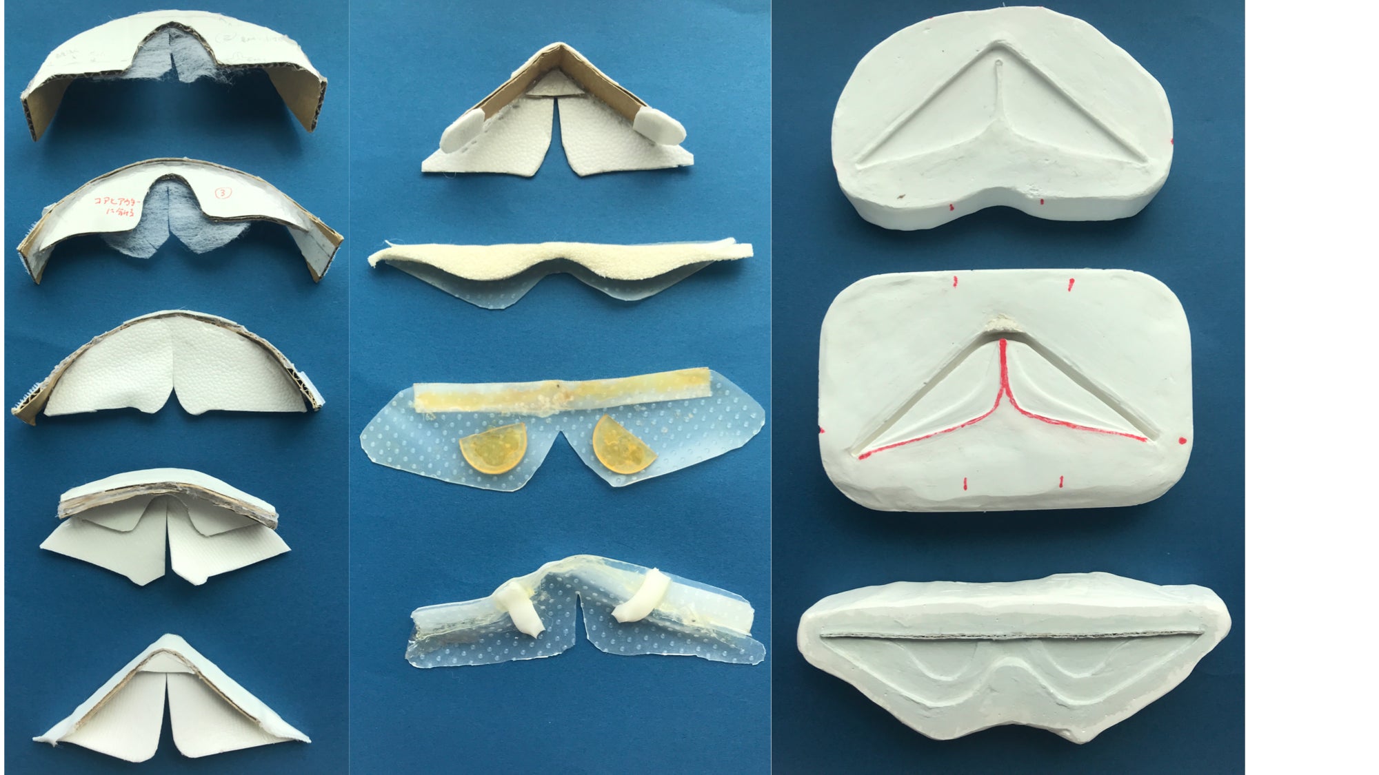 ここでアイデアの方向性は頭の中で完成し、シリコンを使って再製作。そこからさらに半年以上、手作りの型を何度も削って調整しました。振り返ると17種類を作成。写真が失敗から現段階までです。そして、ついに見えない息漏れを無くす仕組みを見える化した結果、メガネが曇らなくなりました。