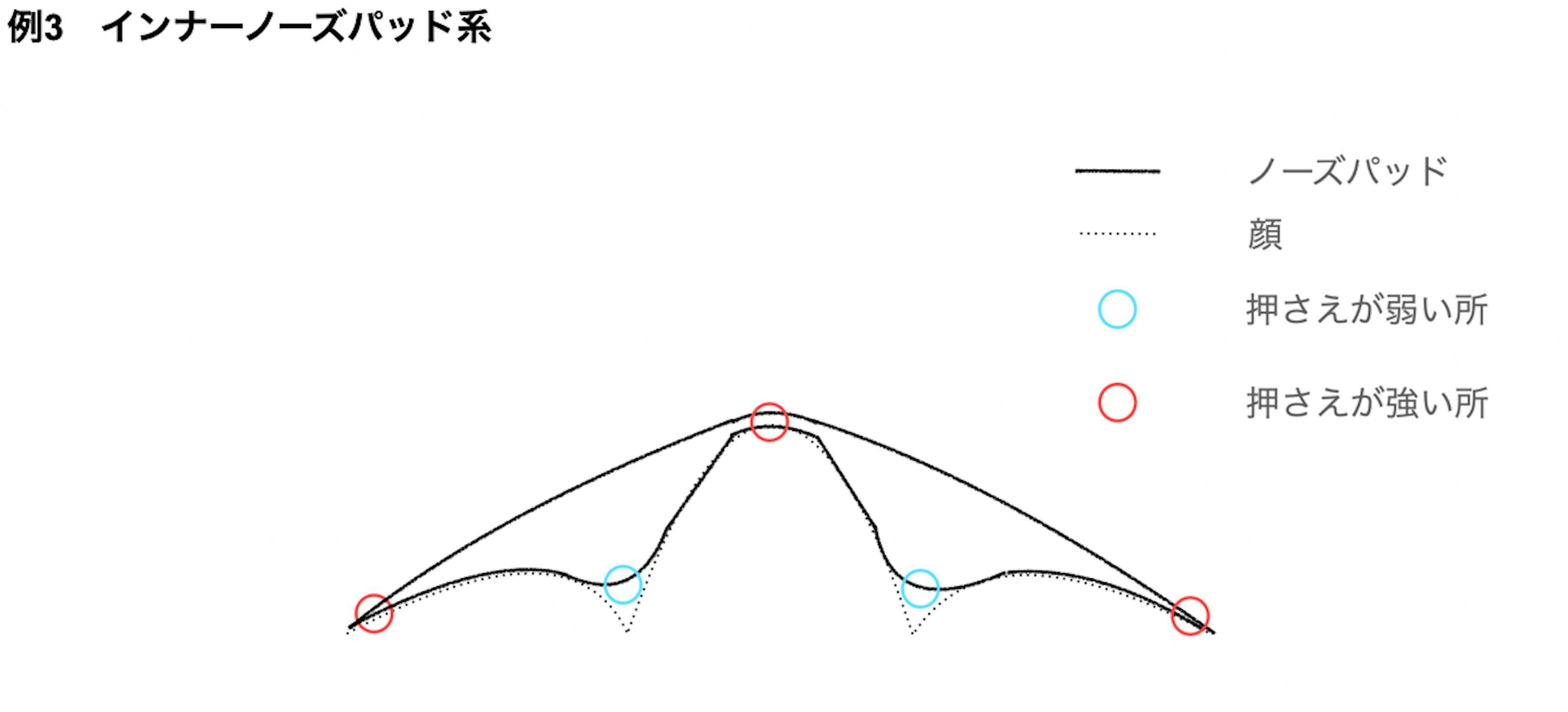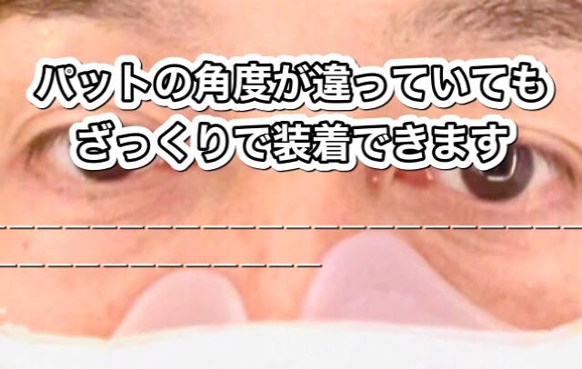 鼻筋が長くても、大きくても、目元に近い部分を押さえることで、パッドが届きます。 つまり 個人差によって鼻筋への装着を上部、下部に調整して お使いいただけます。