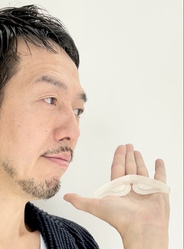 マスクの上縁はワイヤーが入っているのに、なぜ息漏れのすき間ができるのか?発明者は徹底的に研究した。そして、「人間の顔は、鼻の形状や両側の頬の高さ、すべてが異なり、しかも非対称であること」を究明。この研究のこだわりがすごい。こうした観察を経て、シリコン材のパッドを発明した。特長は下部に形成したフランジ(突縁)が小鼻をピッタリ挟み、上に昇る息を完全に抑えてメガネが曇ることを防ぐ。