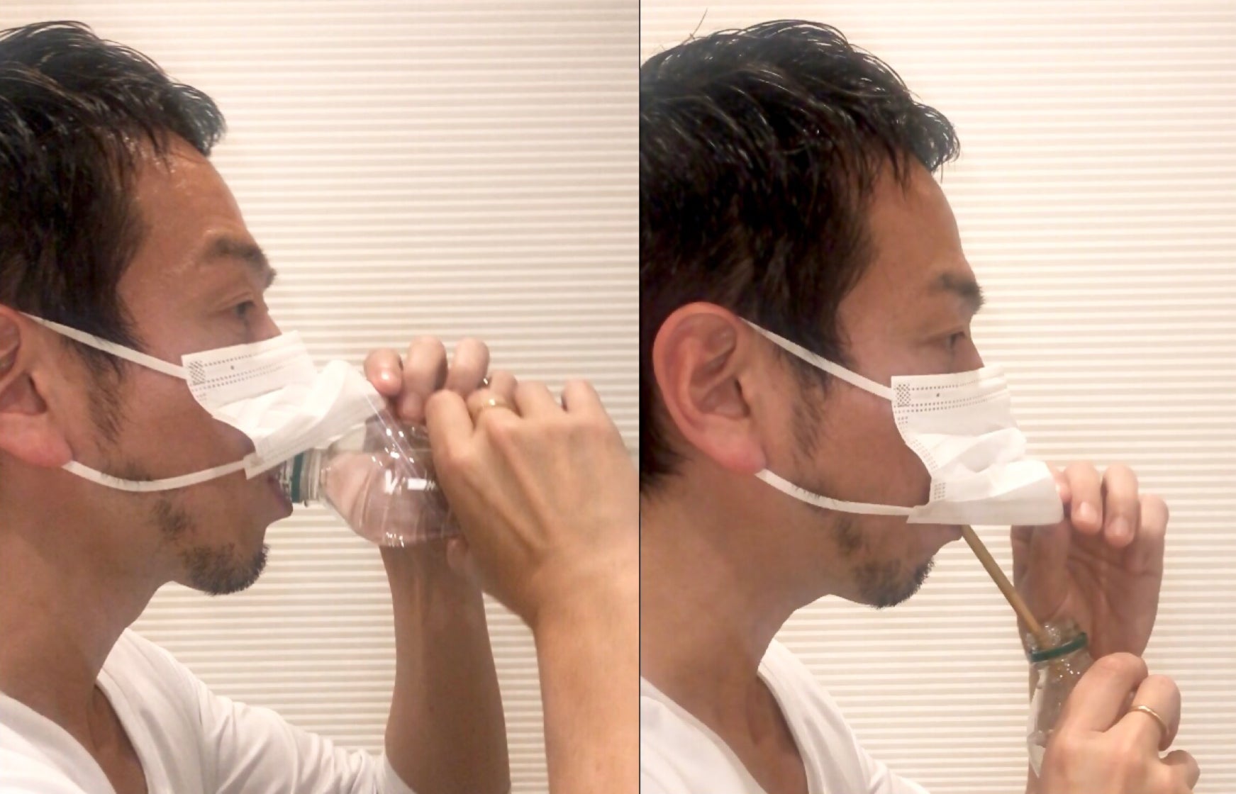 イキソレ〜ルはおさえる事が1番なので、マスクのアゴかけをする度に再装着を両手で行う必要があります。ですが、水分や一口サイズの食品補給ならマスク下から摂ることで仕事や勉強の集中を妨げません。