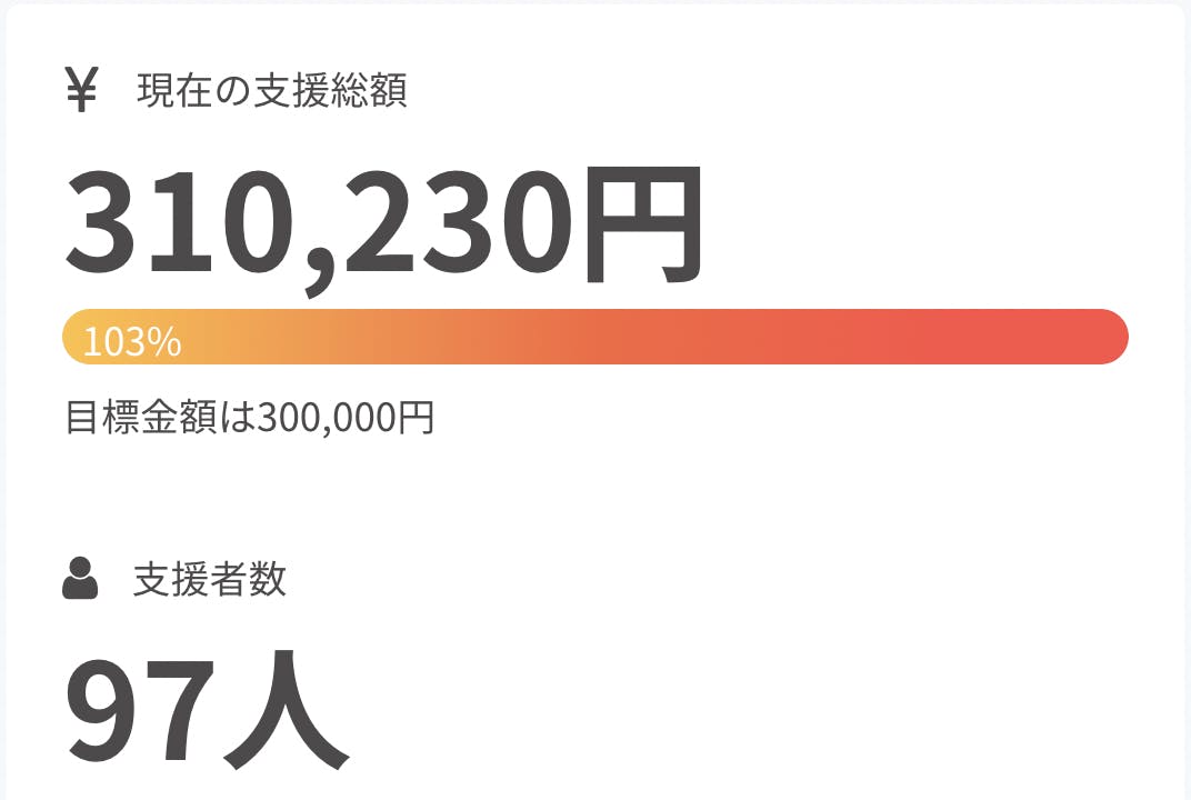 日頃より応援して下さっている、このキャンプファイヤープロジェクトが目標金額を達成する事が出来ました。