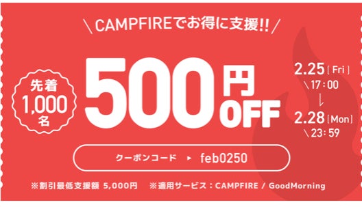 先着1,000名様!CAMPFIREで使える「500円OFFクーポン」をプレゼント! |