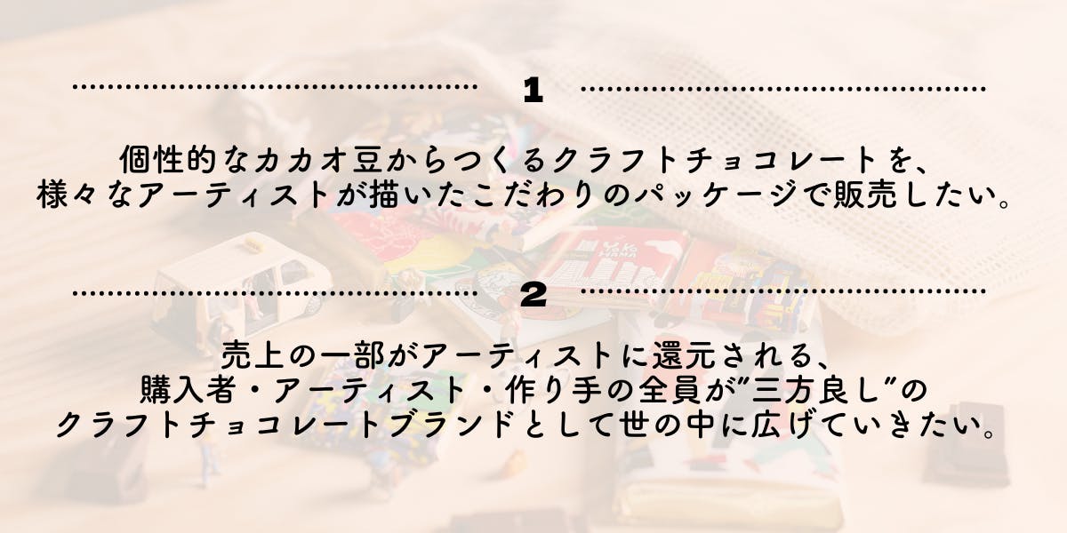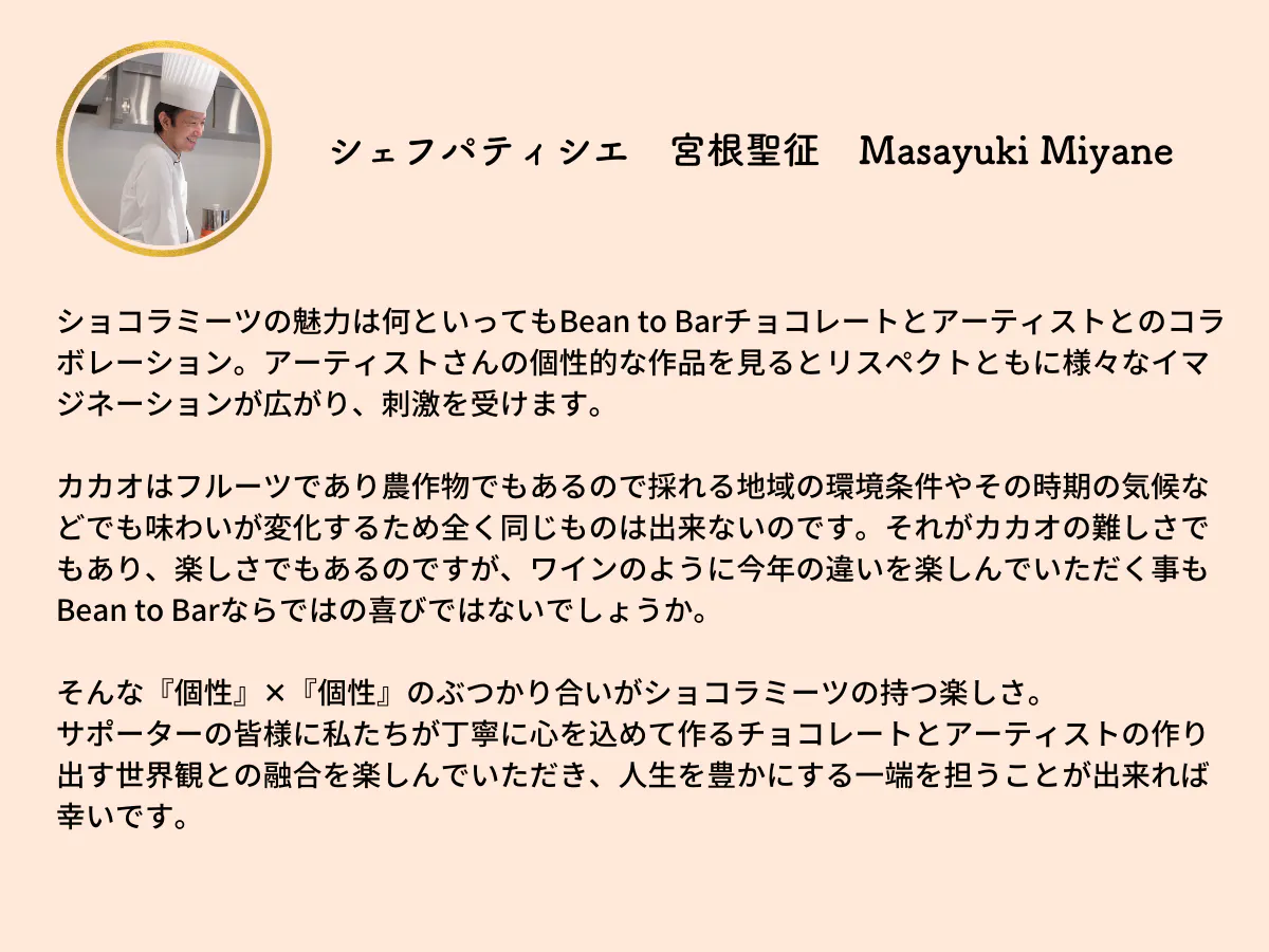 2021/11/18 17:23ショコラミーツ代表の佐々部一宏です。前回のプロジェクトから8ヶ月経ち、本日この度、新たに4名のアーティストとコラボし16種類の新しいアートパッケージの発表のプロジェクトをスタートいたしました!第2回目のプロジェクトの目的は、私たちのコンセプト「Meet My Like:自分の好きを見つける経験」をさらに広げるために、ショコラミーツに新たに参加した4名のアーティストさんのパッケージを皆様にご紹介すること。そしてその結果「カカオ豆生産者・アーティスト・買い手・売り手」という、僕たちショコラミーツに関わる全ての人たちの「幸せの循環」をさらに広げていくためです。初めてショコラミーツを世の中に発表した第1回目のクラウドファンディングでは、僕の「Meet My Like」というコンセプト、そして「チョコレートが売れるたびに売上の一部がアーティストに還元される”幸せの循環”の仕組み」に共感をいただき、多くの方からご支援を頂くことができましたそしてその際にお約束したのが、「幸せの循環」をさらに広げるため、さらに多くのアーティストさんとのコラボを増やすことでした。期間は当初の想像よりも少し遅くなってしまいましたが、無事にこうして第2回目のプロジェクトを迎えることができたのは、前回ご支援をいただきました皆様、その後にショコラミーツのファンとして応援していただいてる皆様、そして今回コラボしていただたアーティストさんなど、多くの方々のおかげだと思っております。このプロジェクトの機会を通じて、より多くの方にショコラミーツを知っていただく機会としておりますので、ぜひ今回のプロジェクトご支援やシェアなど、ご協力をお願いいたします。2021年11月18日ショコラミーツ代表 佐々部一宏 もっと見る