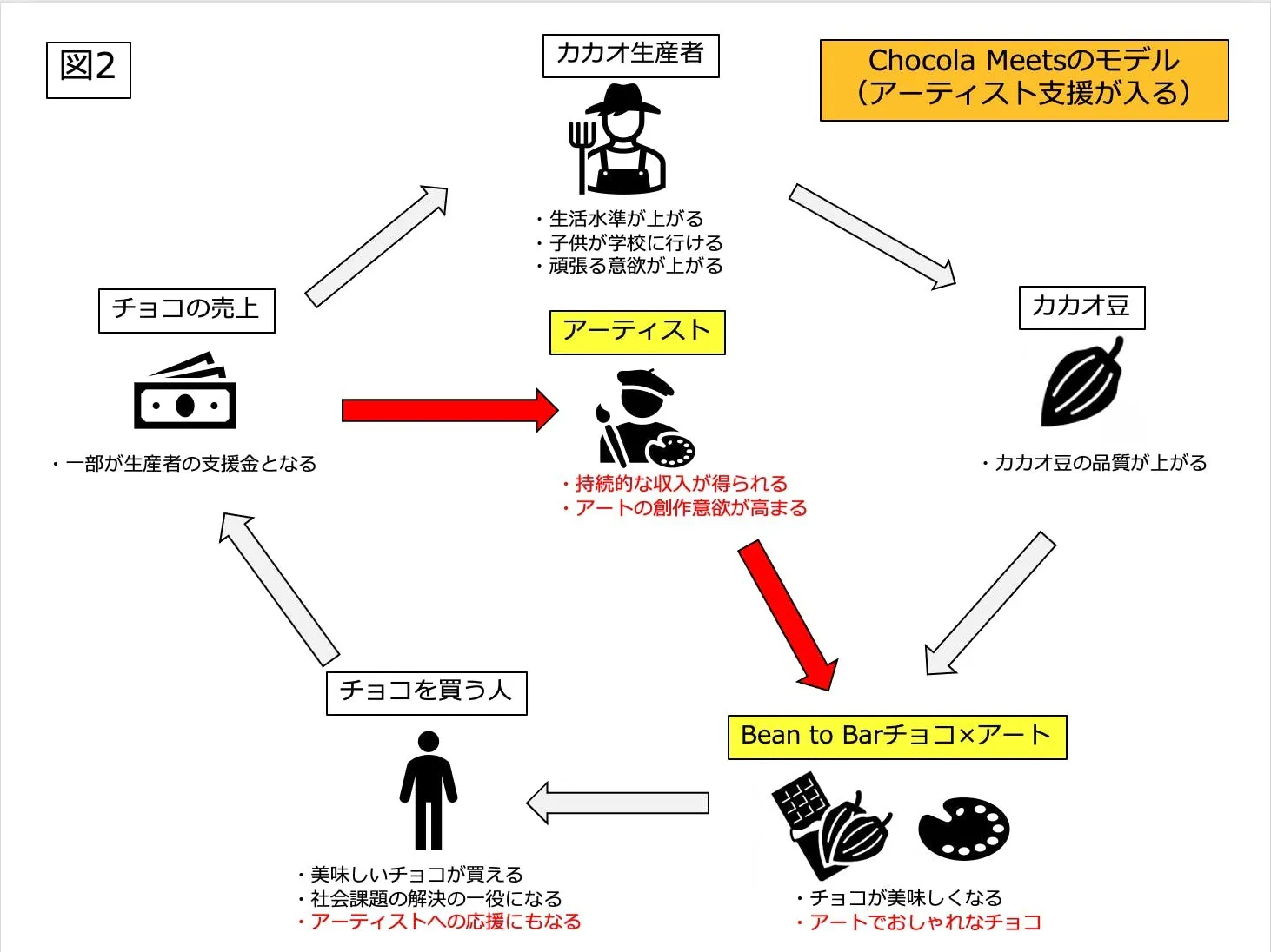 わたしたちショコラミーツのモデルは、従来のモデルに追加してパッケージ制作に関わっているアーティストたちにも支援金が還元される仕組みになっています。ショコラミーツに関わってくださっているすべての方に売上ごとに売上の一部が還元されます。(図2)